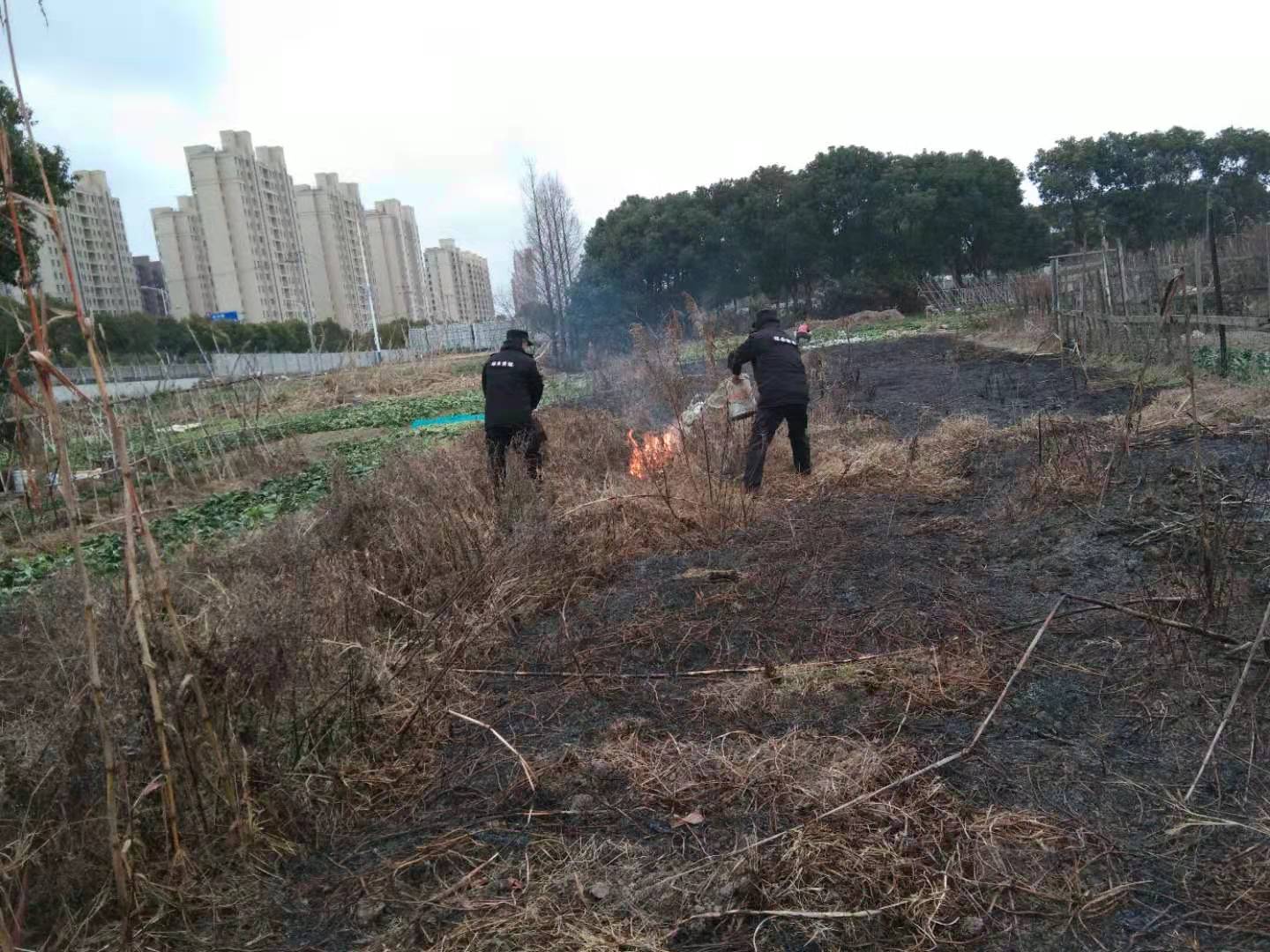 當天12:00左右,孫晉國、陳孟恩、王雙禧巡邏時(shí),發(fā)現紅光地塊附近有濃煙冒起,便立即趕過(guò)去查看。原來(lái)是因村民焚燒垃圾引燃了附近雜草,導致周邊草地大面積起火。情況緊急,三人立刻到附近單位,找來(lái)水桶提水滅火,經(jīng)過(guò)近一個(gè)小時(shí)的撲救,終于將火撲滅。