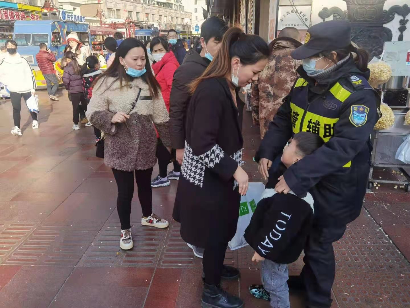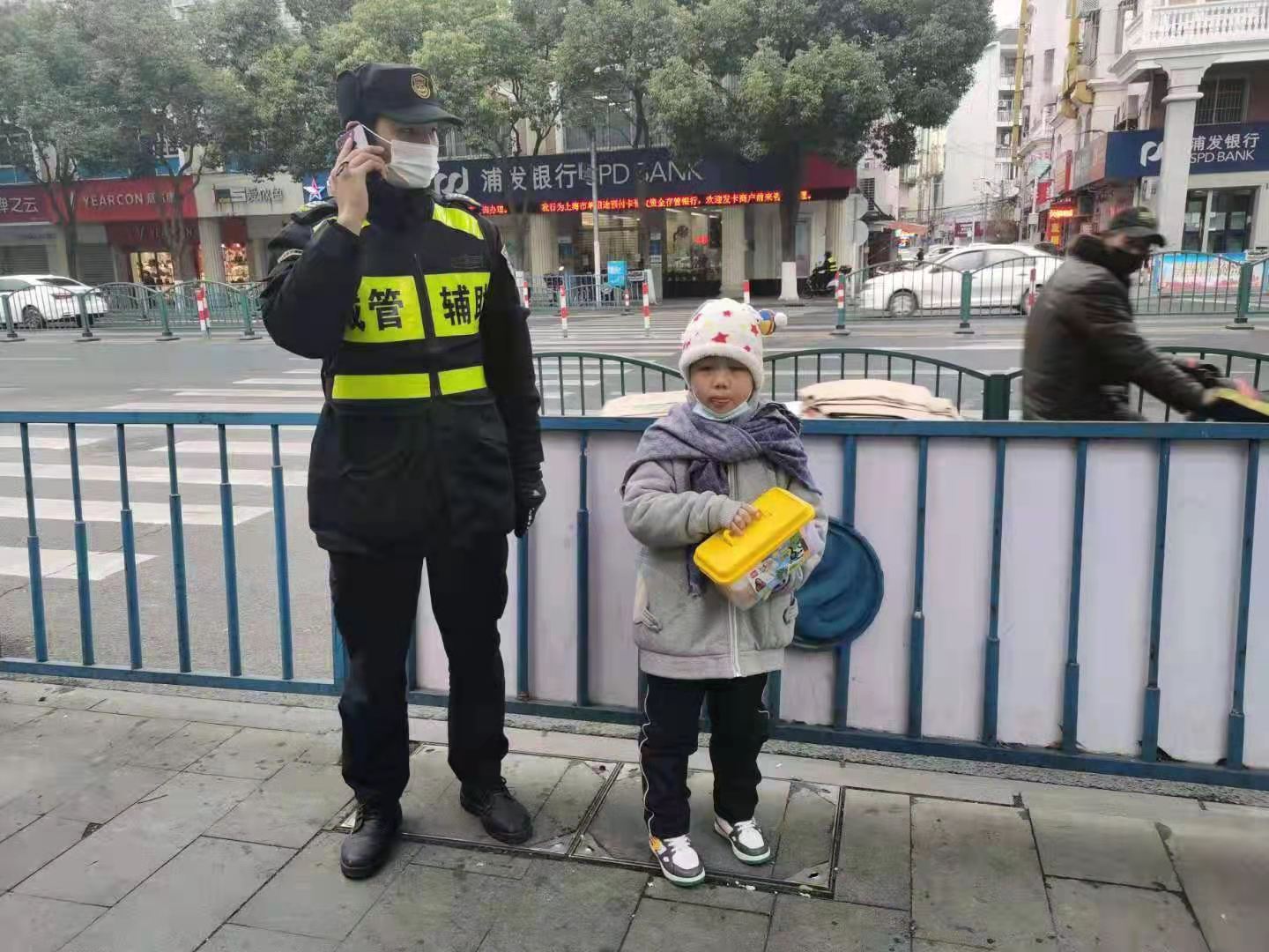 1月5日,宗保公司駐周浦市容機動(dòng)組隊員鄒學(xué)峰幫助走散女童找到家人。