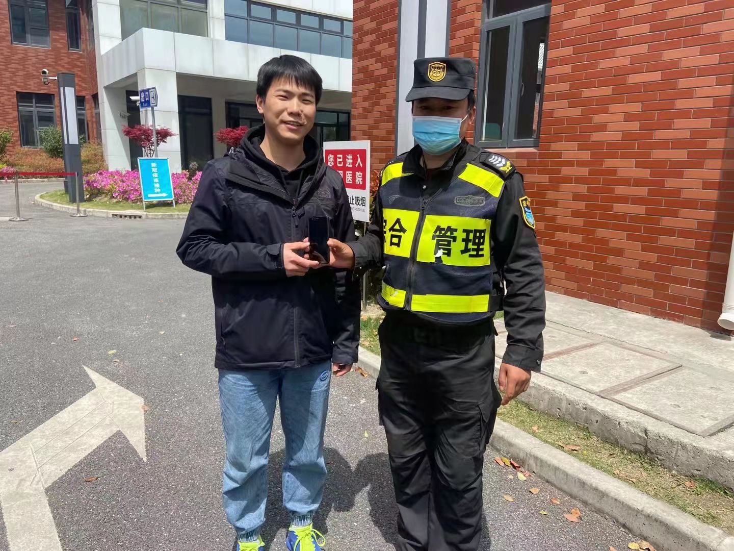 當日,王續光在高行鎮高南衛生院大門(mén)口測溫值勤時(shí),在門(mén)口花壇邊撿到一部手機,便上報給隊長(cháng)。因考慮到手機可能是打疫苗的居民遺失的,隊長(cháng)就讓他在原地等待。大約半個(gè)小時(shí)后,有個(gè)中年男子前來(lái)尋找,經(jīng)過(guò)密碼驗證解鎖手機后,王續光便將手機歸還給他。