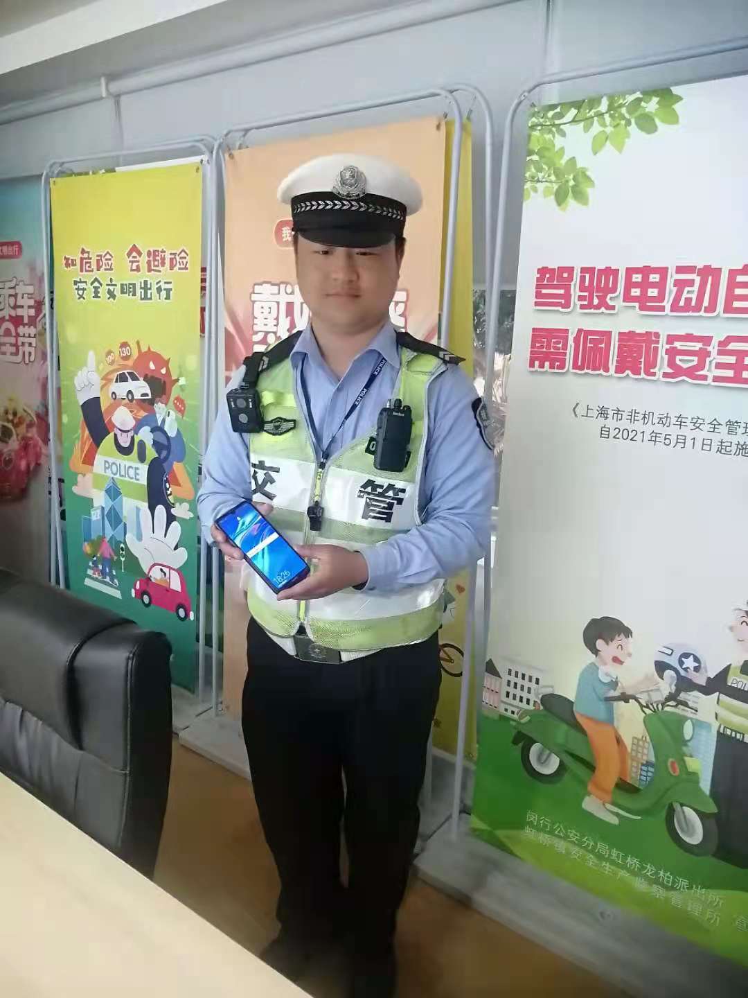 5月17日,宗保公司駐閔行虹橋龍柏交管輔警項目隊員撿到手機,歸還失主。