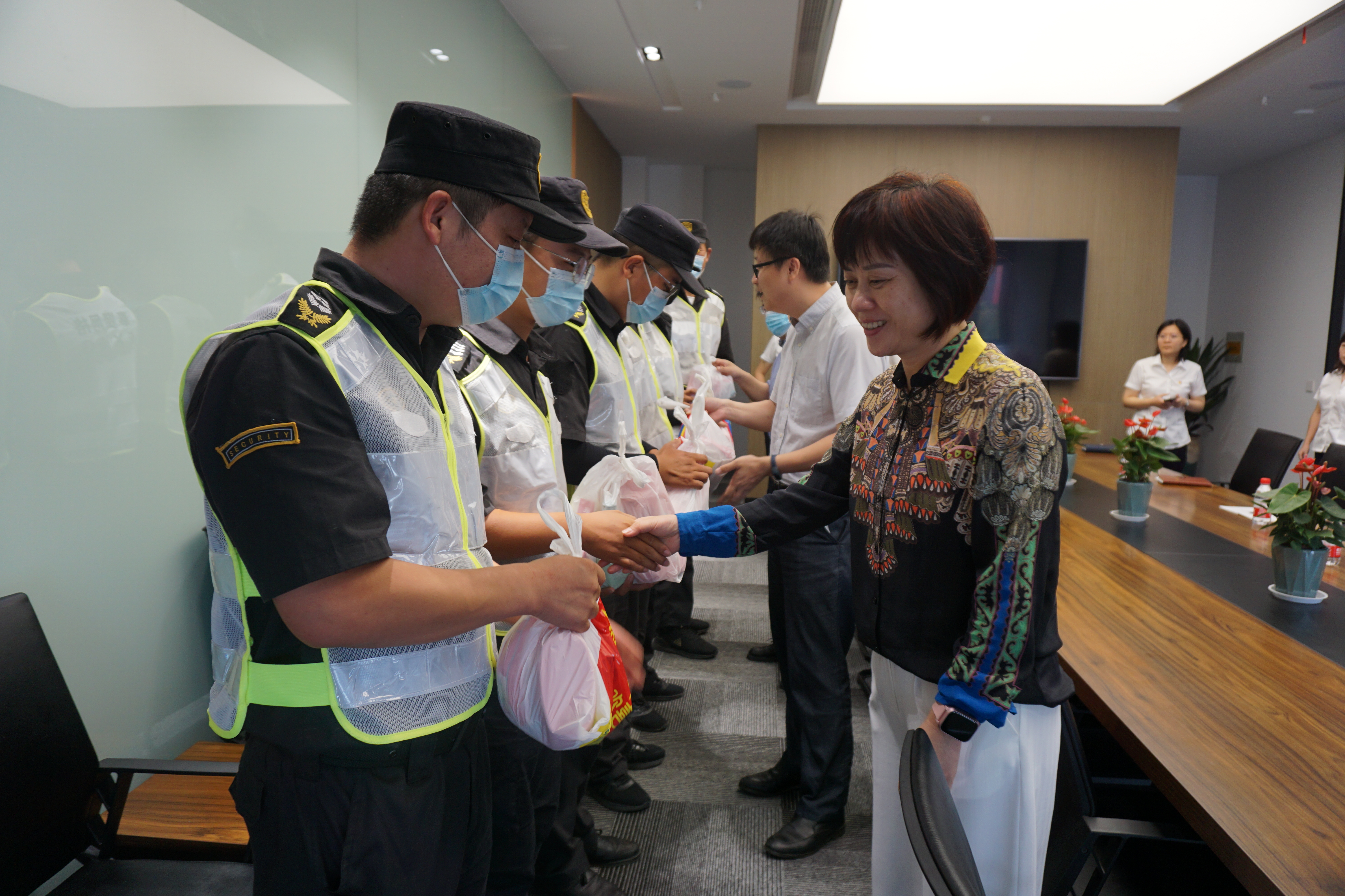 朱衛芳主任親切地與隊員握手,詳細地詢(xún)問(wèn)了隊員的工作、生活等情況,為他們送上了防暑降溫用品。同時(shí),肯定了大家為奉賢網(wǎng)格工作所作的努力,叮囑大家夏季天氣炎熱,一定要備好常用防暑藥品,做好戶(hù)外防暑降溫工作。