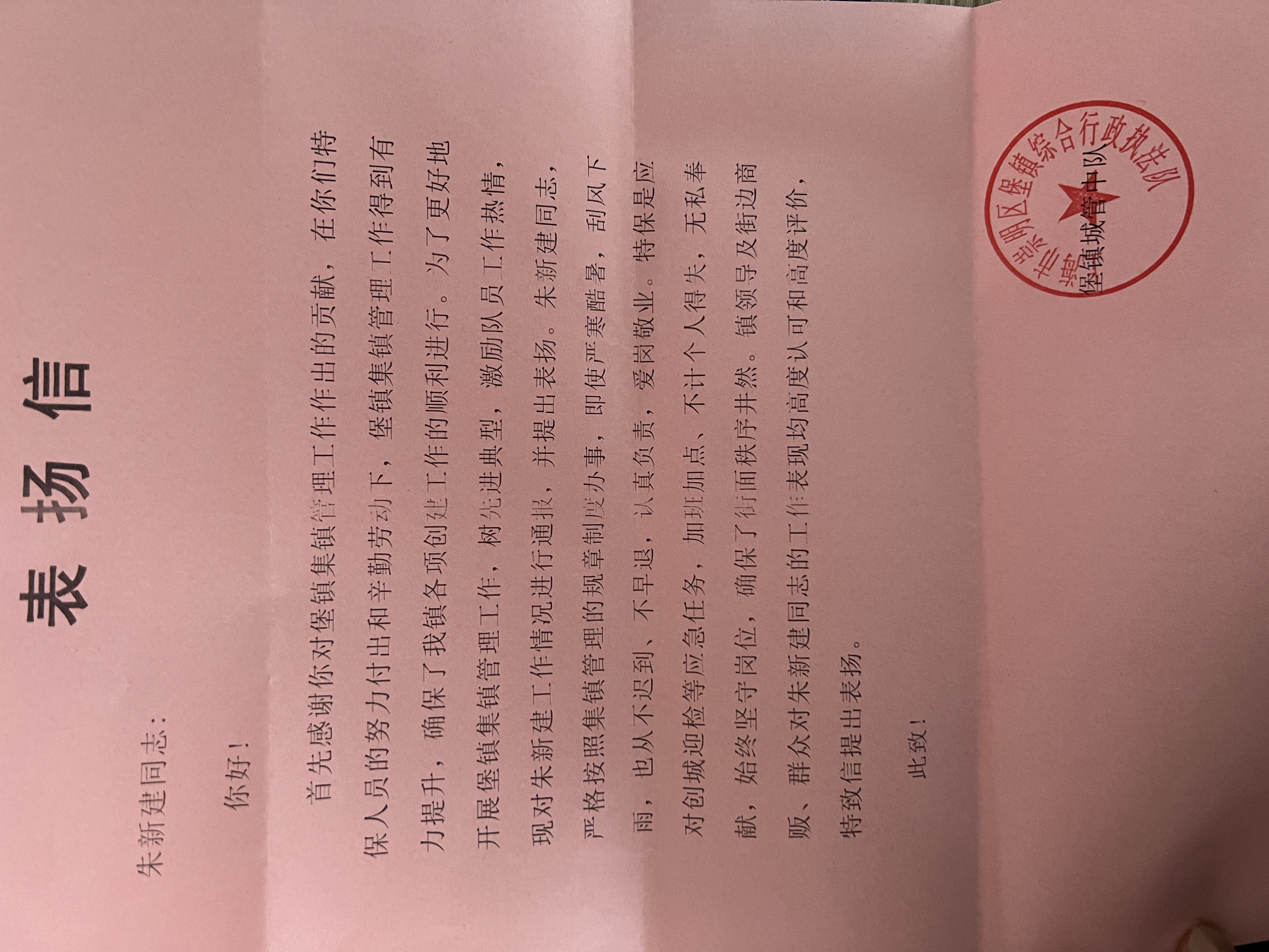 12月24日,宗保公司駐崇明堡鎮項目收到堡鎮城管中隊的表?yè)P信,信中對宗保隊員朱新建盡心履責的工作表現提出特別表?yè)P。