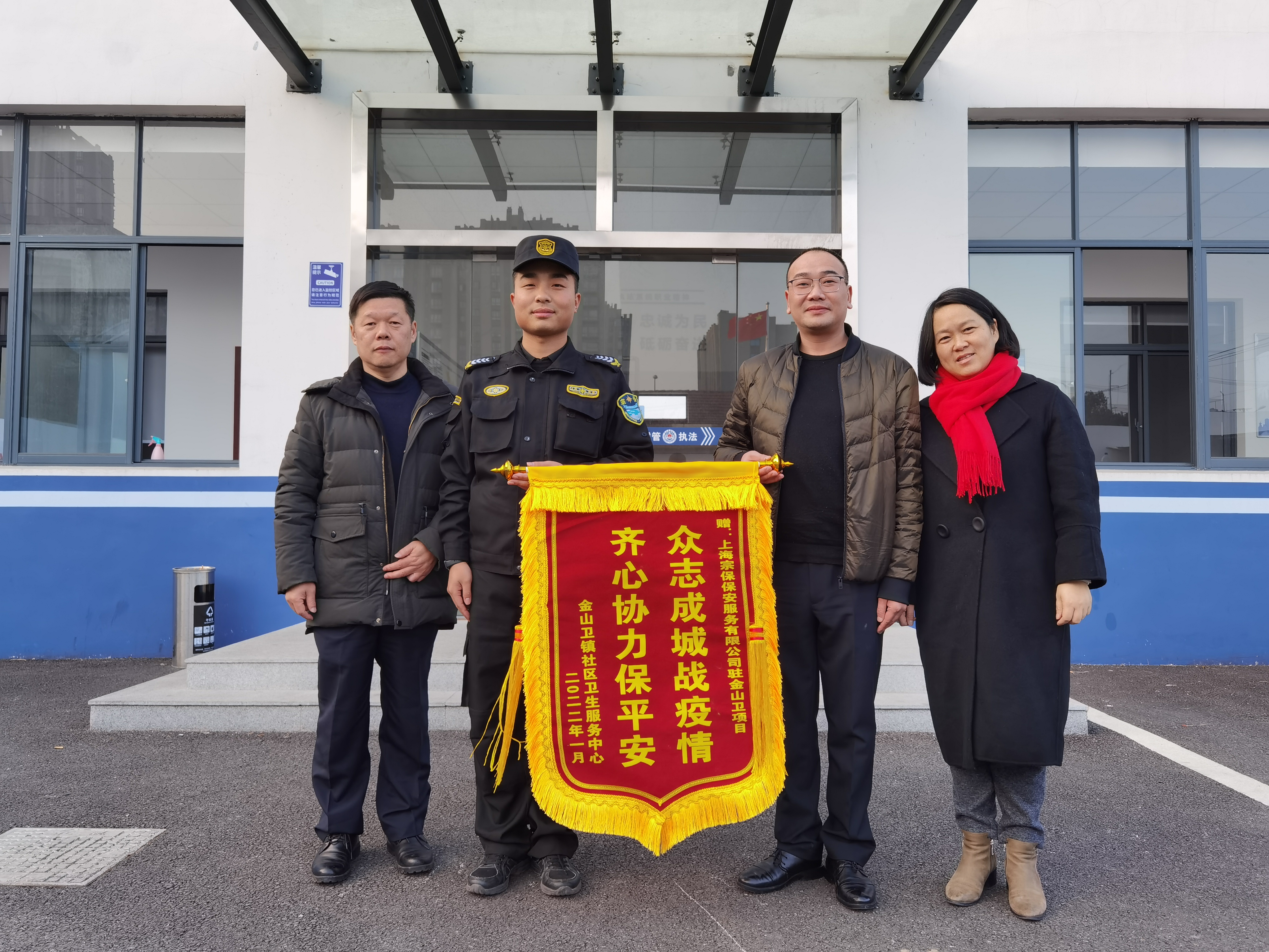 1月18日,金山衛社區衛生服務(wù)中心高浩美院長(cháng)將繡有“眾志成城戰疫情 齊心協(xié)力保平安”的錦旗送到宗保公司駐金山衛項目,表?yè)P宗保隊員出色的工作表現。