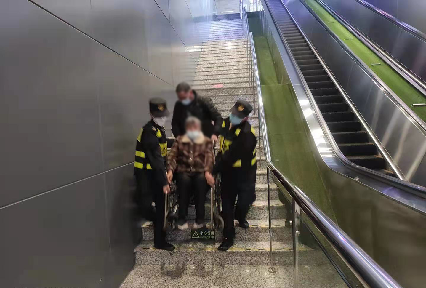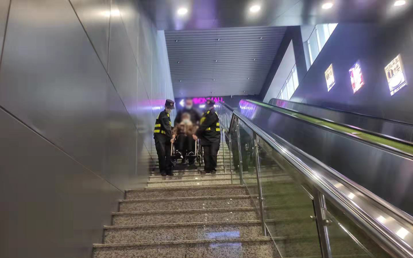 張彬洋和樊粵強主動(dòng)幫忙將老人抬下樓梯。因樓梯陡長(cháng),兩人抬起輪椅時(shí)格外小心,不敢直起腰,生怕老人從輪椅上滑下來(lái),直至將老人安全地抬下樓梯,送到了地鐵候車(chē)區域。