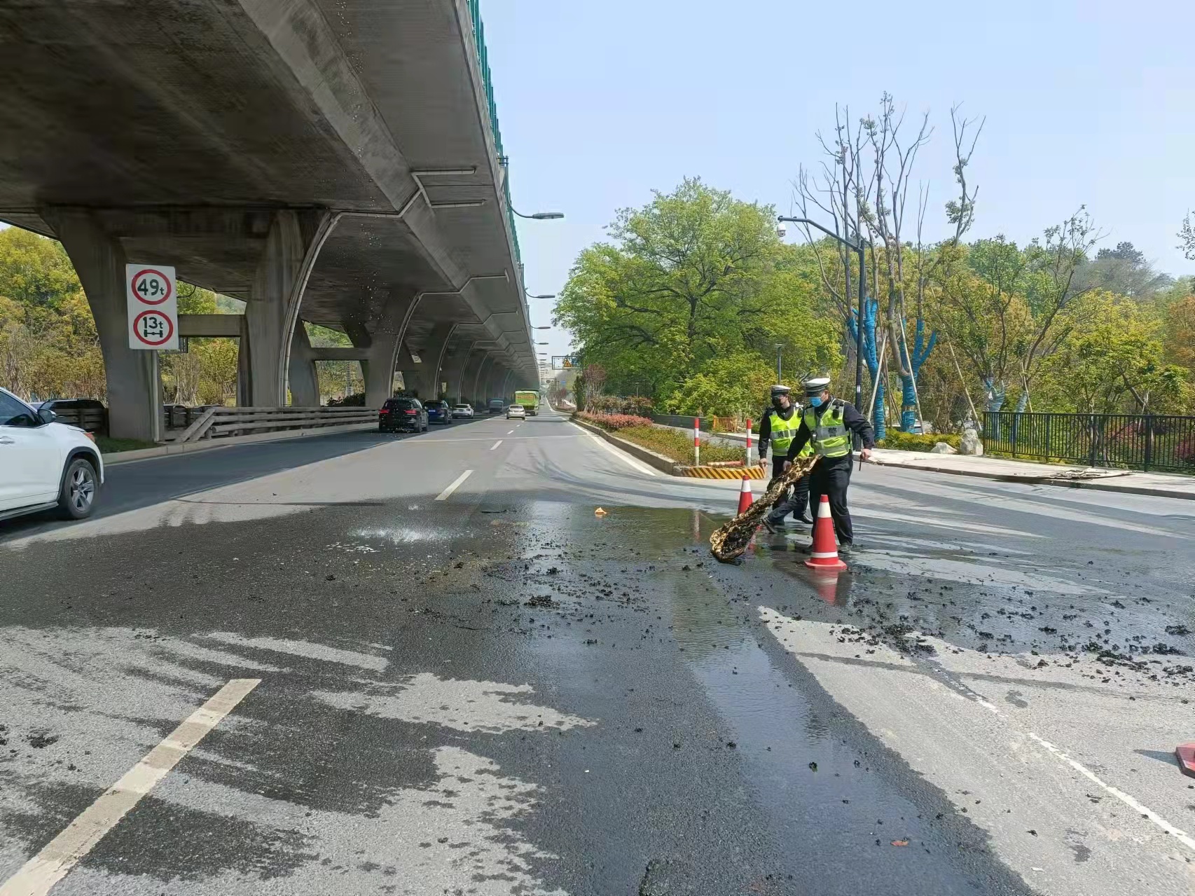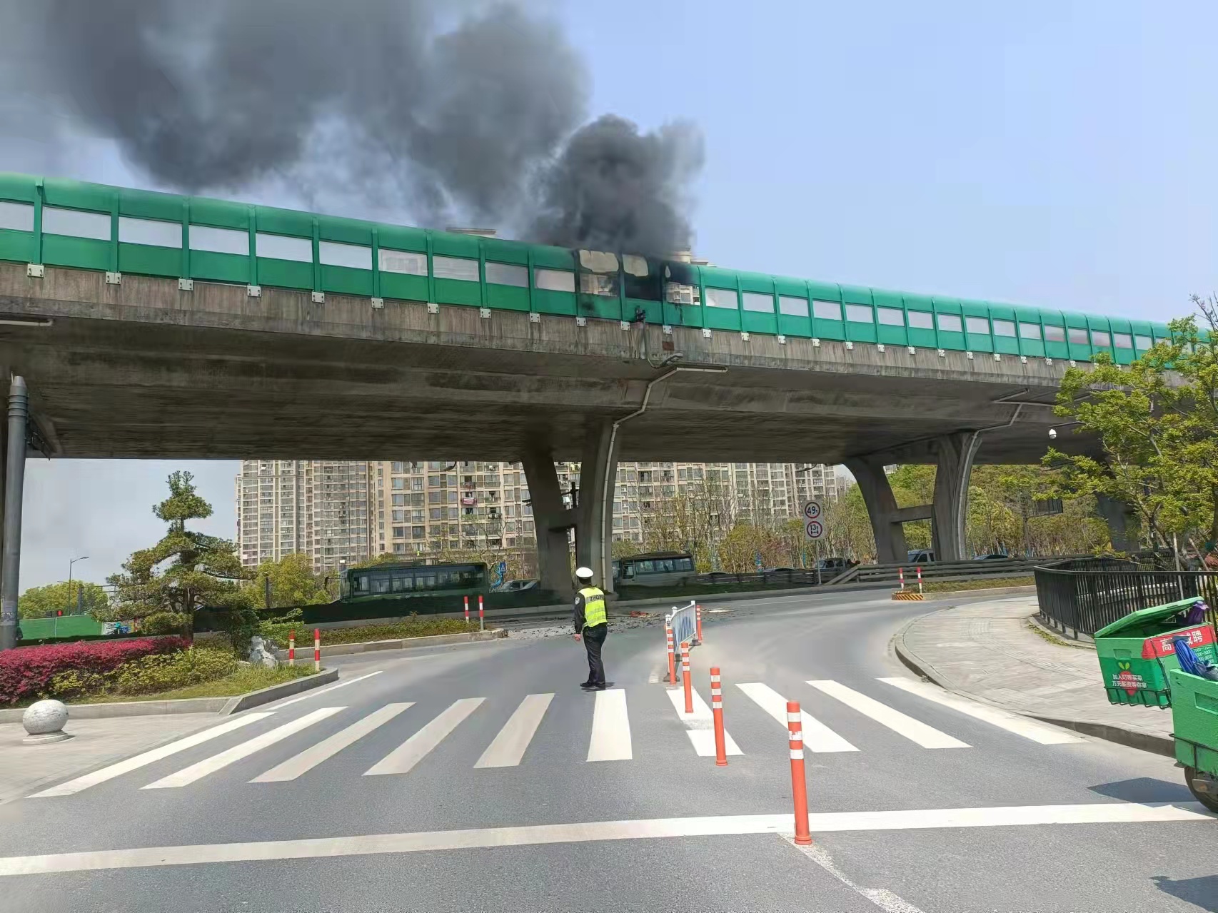 當幾個(gè)人趕到高架橋下時(shí),發(fā)現高速隔離板處有明火在燃燒,玻璃碎渣不時(shí)掉落下來(lái),橋下情況十分危險。見(jiàn)此情形,馮奧立即將情況上報工作站值班領(lǐng)導,協(xié)助引導路面車(chē)輛避開(kāi)繞行,安排同事封閉右轉專(zhuān)用車(chē)道,避免過(guò)往車(chē)輛和行人受到傷害。