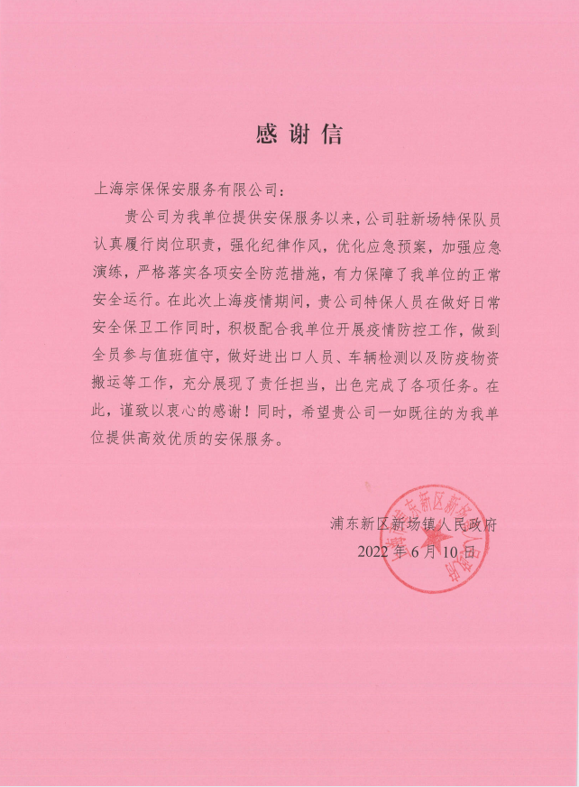 6月10日,宗保公司收到浦東新區新場(chǎng)鎮人民政府的感謝信,感謝公司對新場(chǎng)鎮疫情防控工作的大力支持。