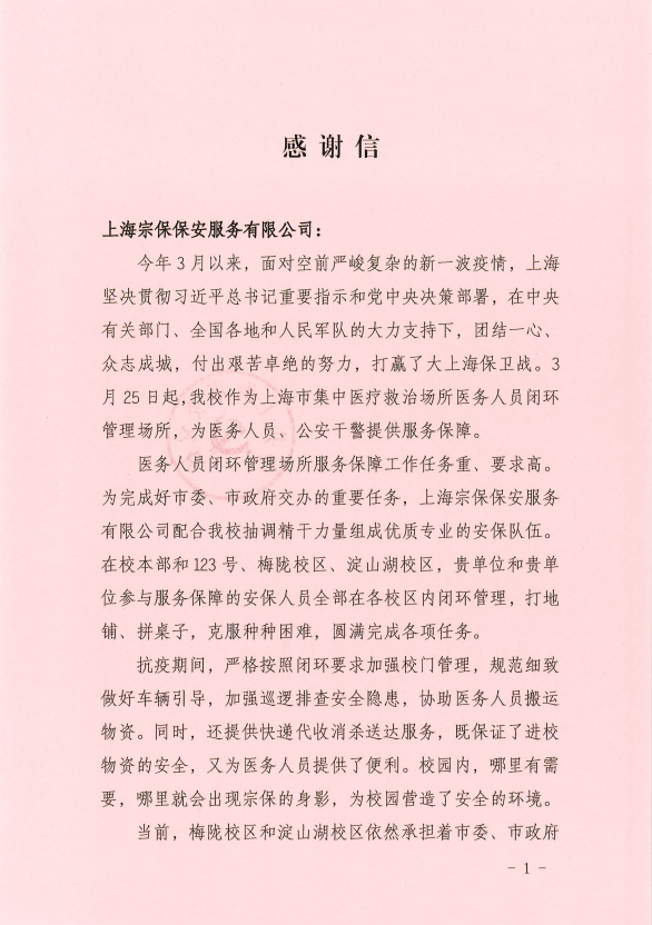 6月28日,中共上海市委黨校送來(lái)感謝信,感謝疫情防控期間宗保公司員工全力配合市委黨校為醫務(wù)人員提供有力的服務(wù)保障。