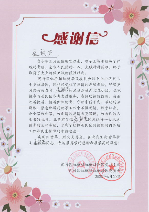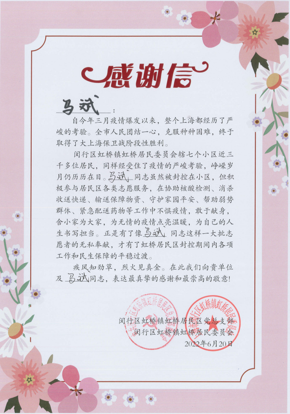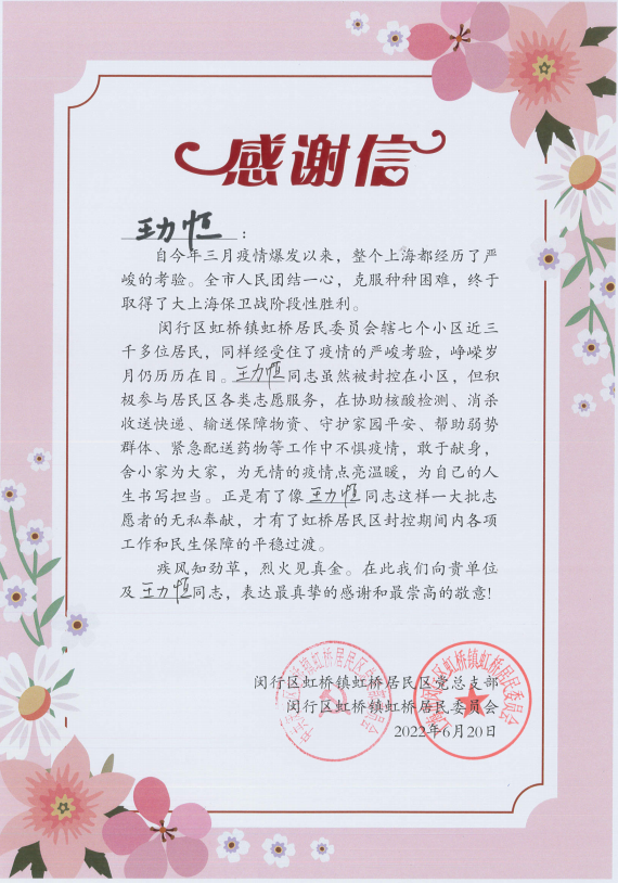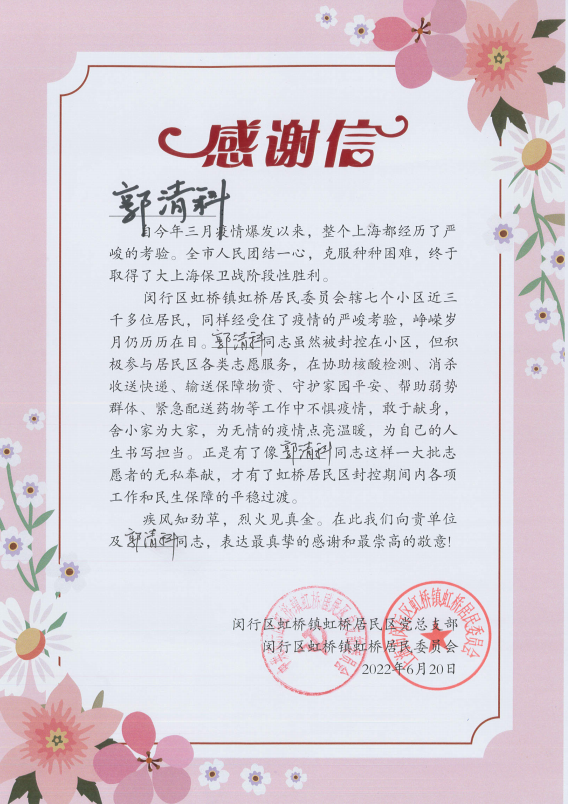 6月30日,閔行區虹橋鎮虹橋居民區黨總支部和閔行區虹橋鎮虹橋居民委員會(huì )送來(lái)感謝信,真摯地感謝疫情防控期間宗保員工全力配合居委開(kāi)展疫情防控所做的工作。