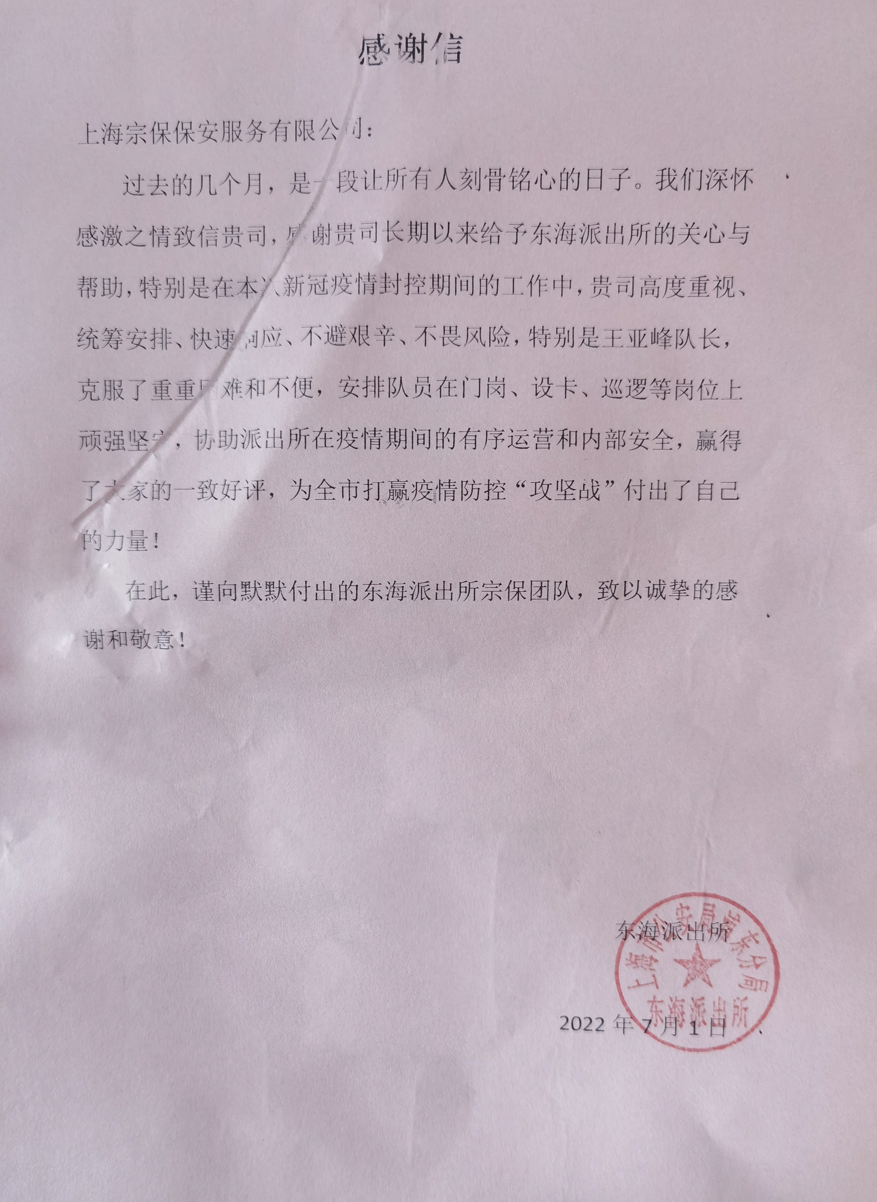 7月1日,浦東公安分局東海派出所送來(lái)感謝信,感謝宗保公司對派出所疫情防控工作的傾心協(xié)助和鼎力支持。