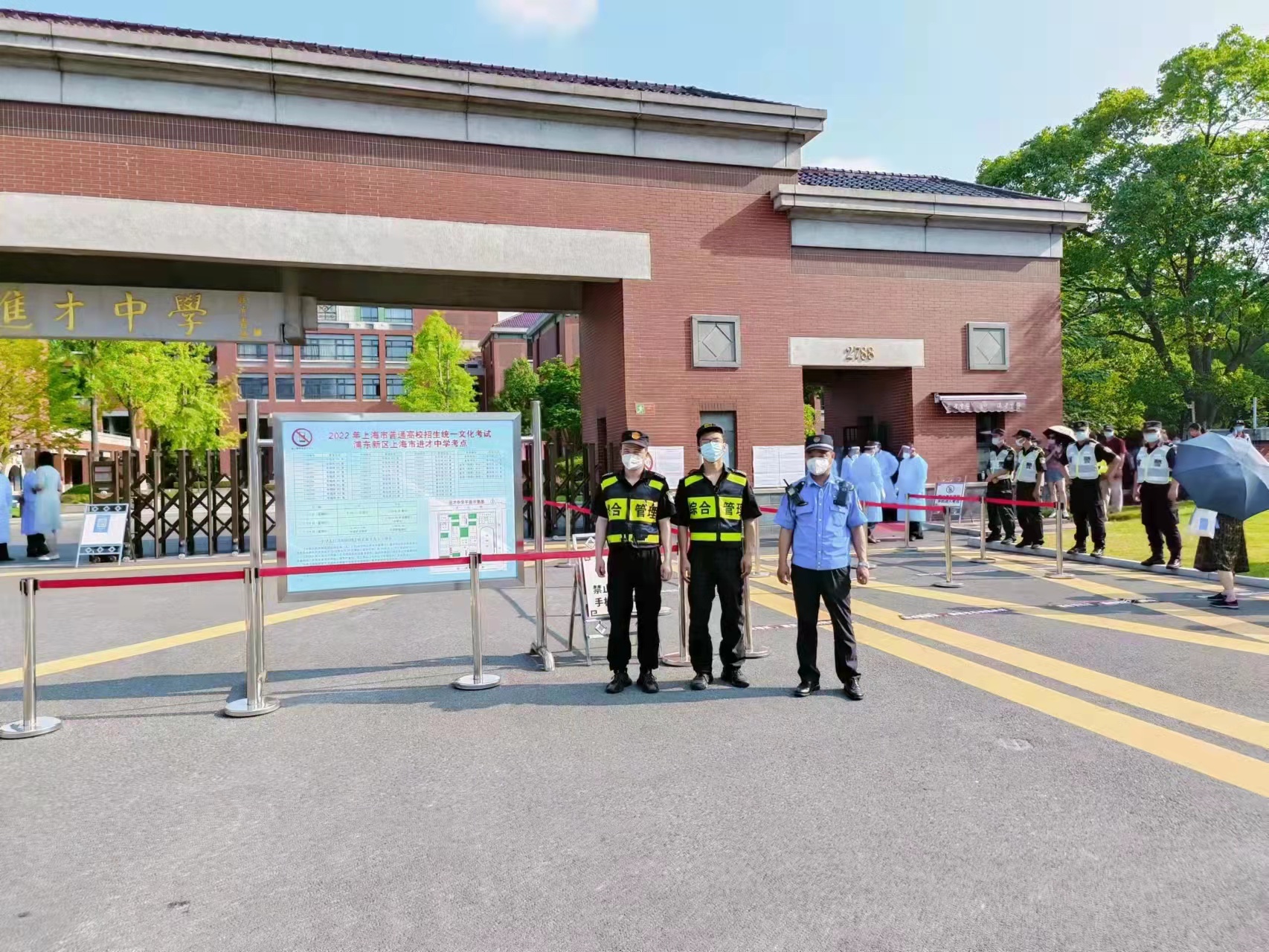 7月7日起,上海市陸續迎來(lái)了2022年普通高校招生全國統一考試和2022年初中學(xué)業(yè)水平考試。宗保公司承擔了建平中學(xué)、進(jìn)才中學(xué)、周浦中學(xué)、吳迅中學(xué)、滬東長(cháng)島中學(xué)、楊思高級中學(xué)、南匯一中、南匯中學(xué)、閔行外國語(yǔ)中學(xué)等17個(gè)考點(diǎn)的秩序維護任務(wù),配合轄區公安機關(guān)、校方維持各考點(diǎn)高考和中考秩序。