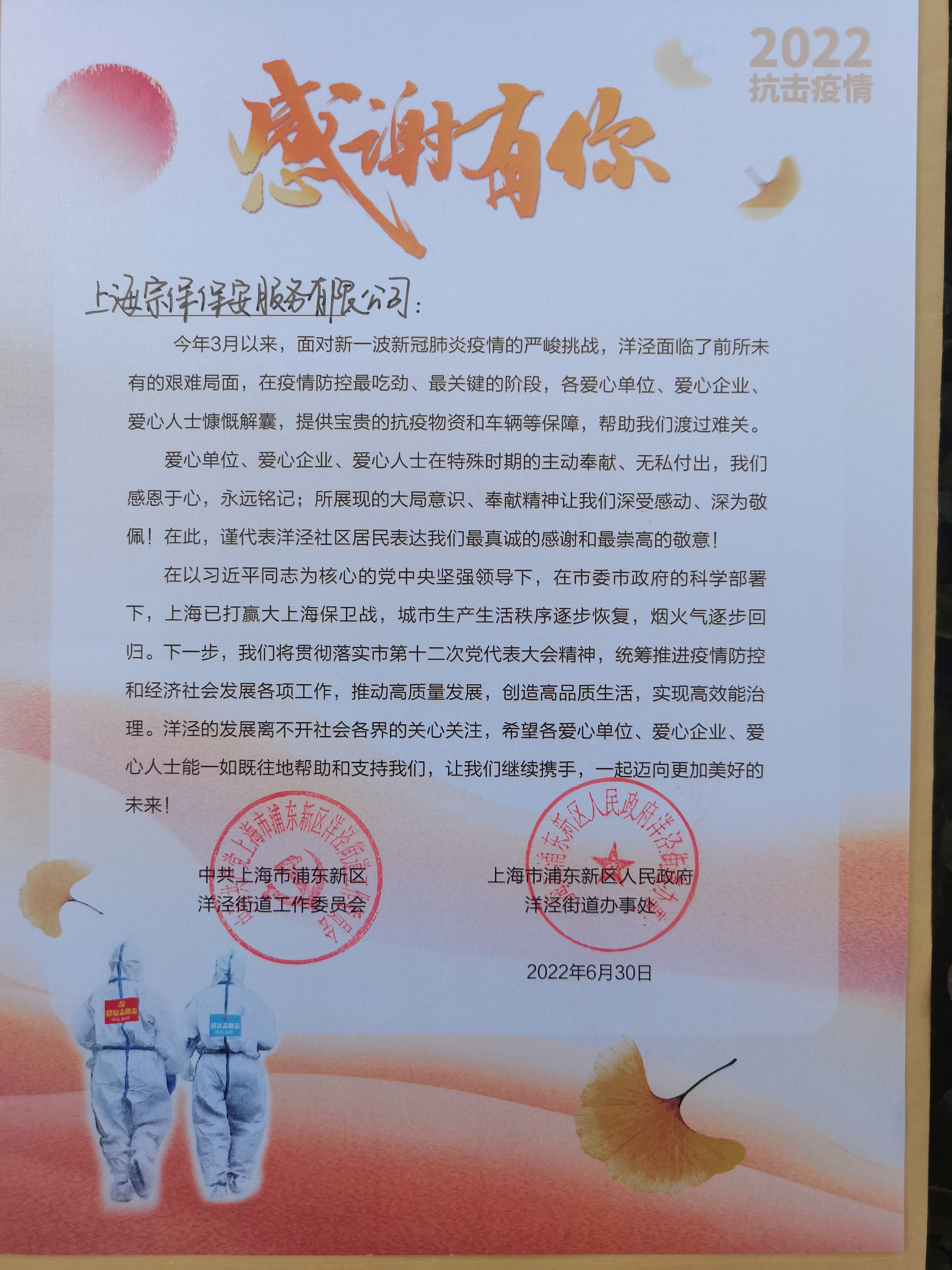 7月29日,宗保公司收到浦東新區洋涇街道黨工委和洋涇街道辦事處送來(lái)的感謝信,感謝公司疫情防控期間對洋涇街道疫情防控工作的大力支持。
