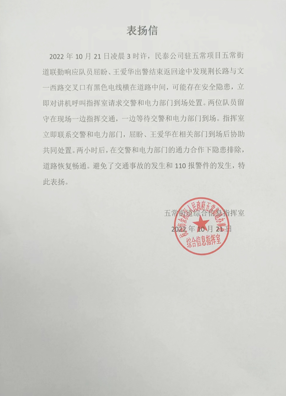 10月21日,浙江民泰公司駐杭州市余杭區五常市容項目員工協(xié)助處理掉落電線(xiàn),消除道路安全隱患。