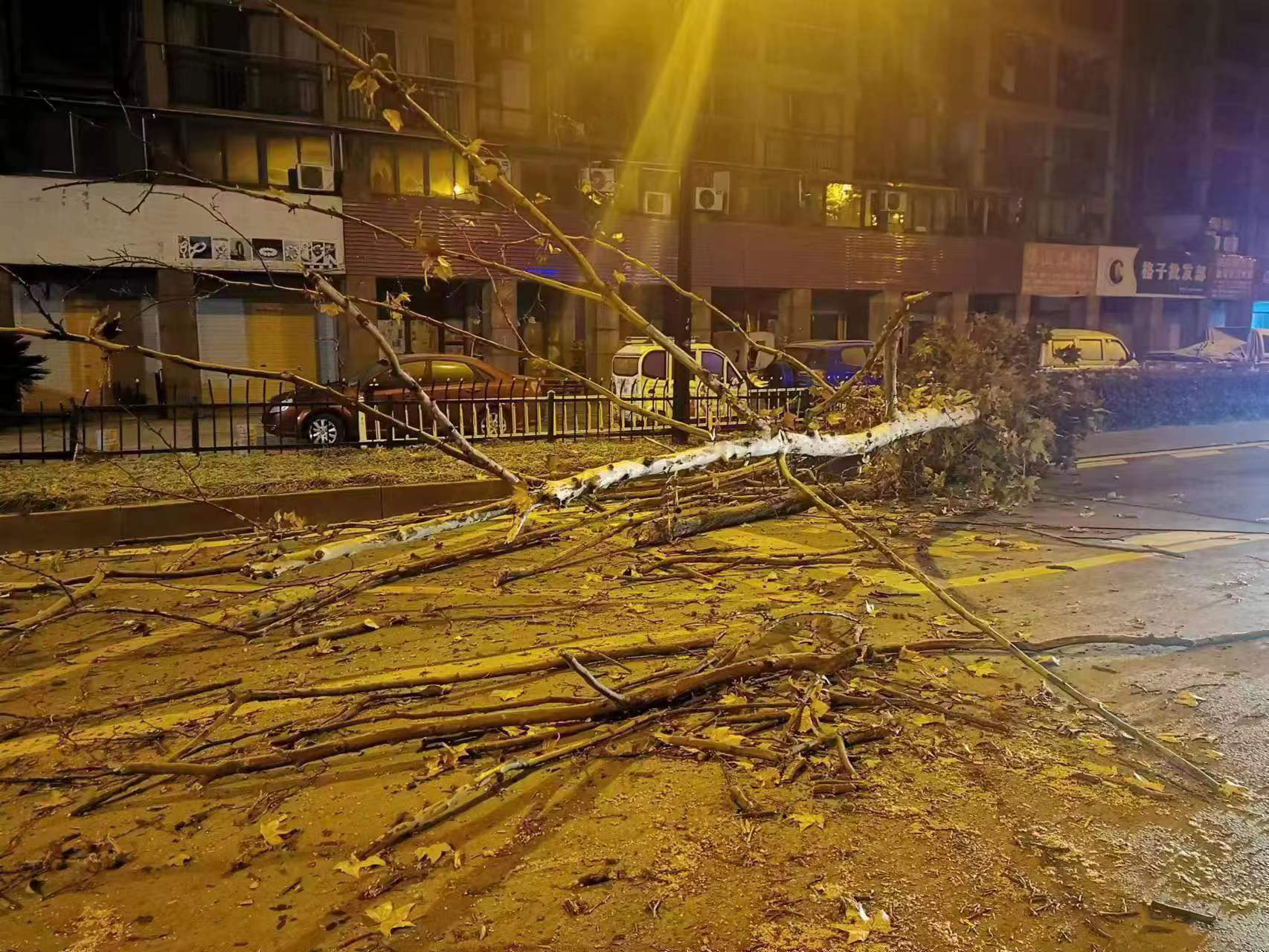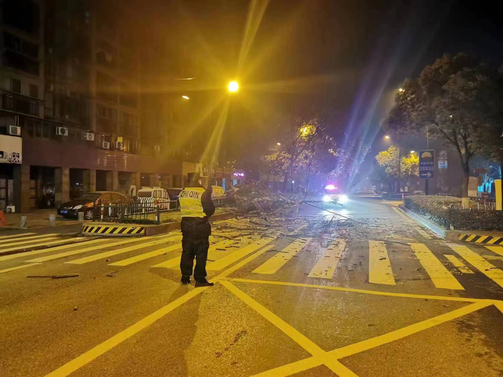 兩人迅疾來(lái)到現場(chǎng),一棵大樹(shù)折斷后橫在馬路上,凌亂的枝干正好將馬路攔腰截斷,車(chē)輛通行嚴重受阻。由于時(shí)值凌晨,附近商戶(hù)沒(méi)有開(kāi)門(mén),兩人也無(wú)排障工具,于是就在現場(chǎng)設立了警戒線(xiàn),向指揮中心報告情況并呼叫增援。