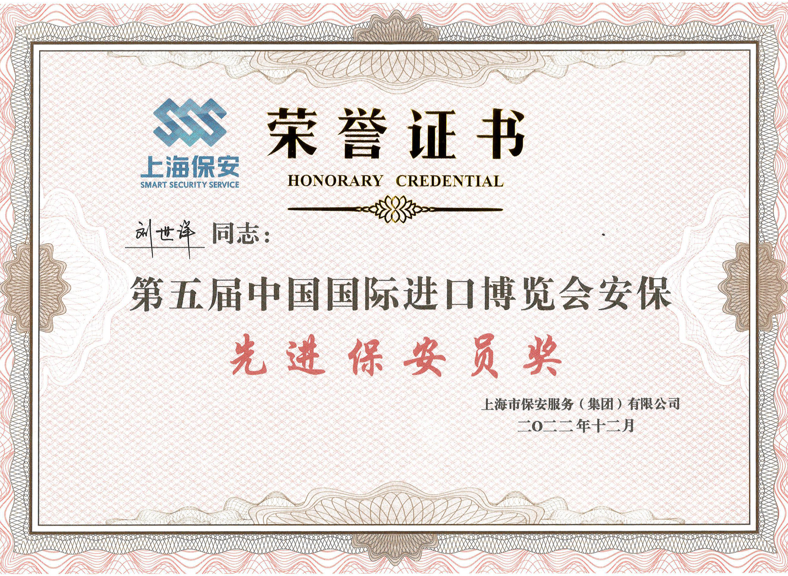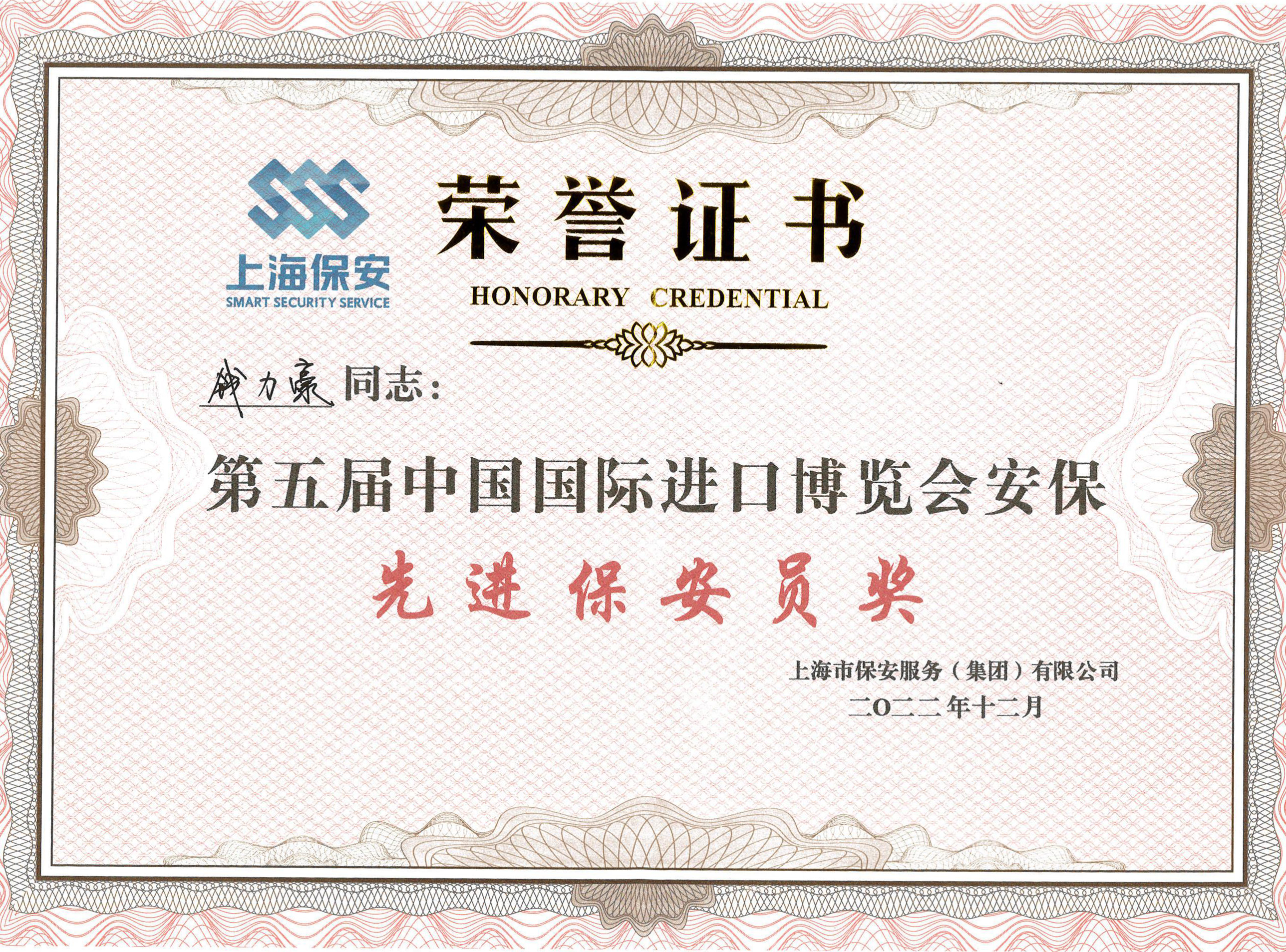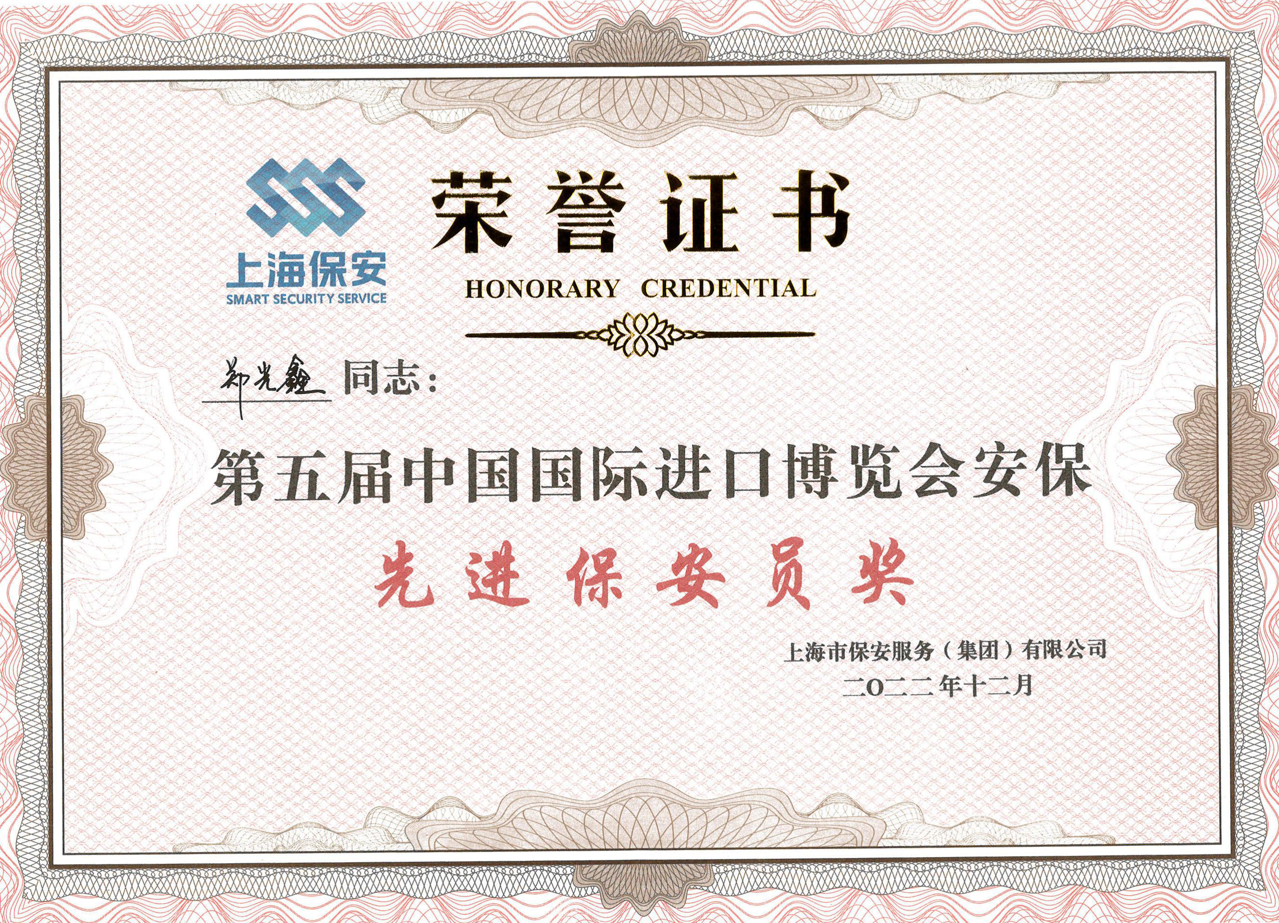 近日,上海市保安服務(wù)(集團)有限公司對參加第五屆中國國際進(jìn)口博覽會(huì )的保安員進(jìn)行了表彰。公司員工梁澤迪、錢(qián)力豪、劉世洋、宋琳、李帥、李俊、鄭光鑫和張艷森因工作表現突出,榮獲第五屆中國國際進(jìn)口博覽會(huì )安?!跋冗M(jìn)保安員獎”。