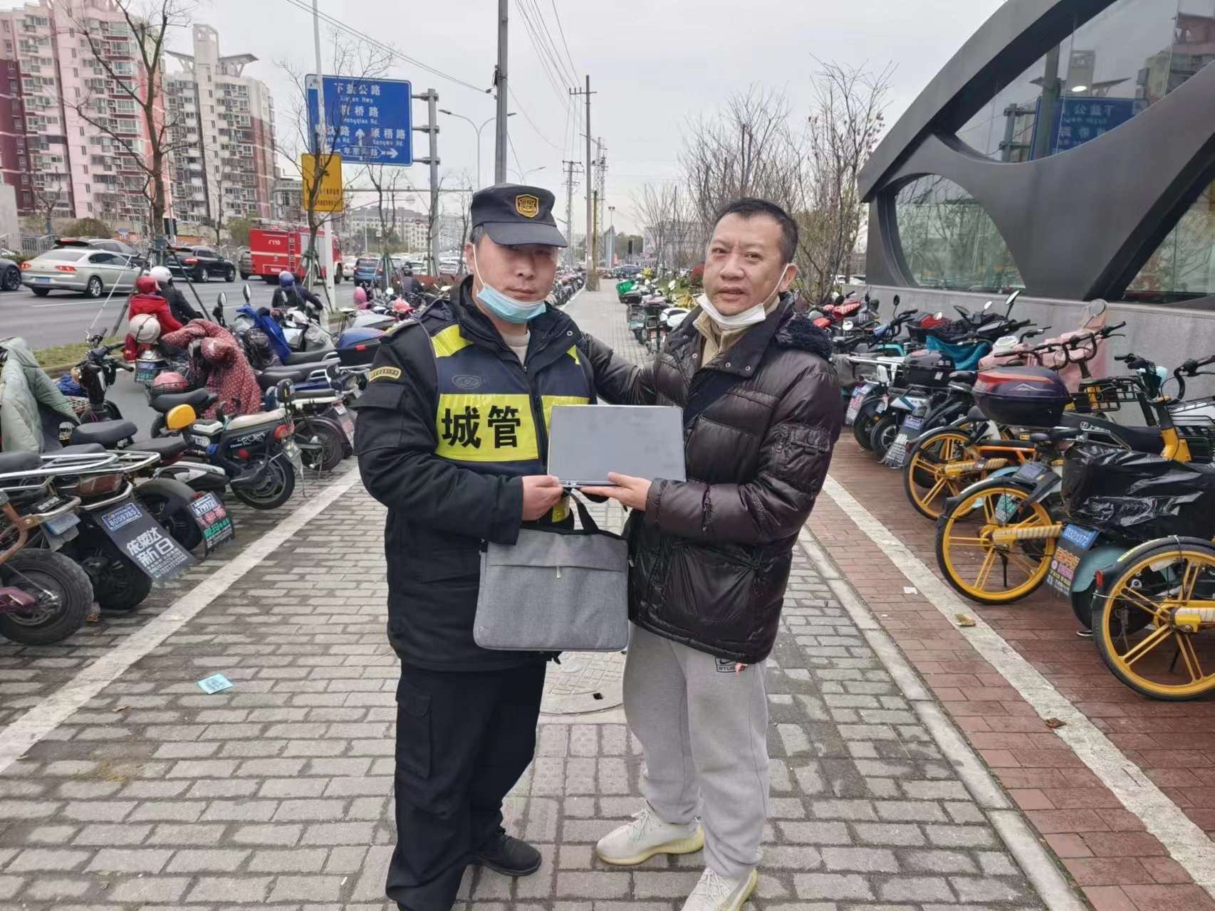 大約過(guò)了30分鐘,一位身穿黑衣的男子返回現場(chǎng)尋找。王旗核實(shí)確認其是失主后,就將手提袋交還給了該男子。男子十分高興連連表示感謝,執意拿出現金給王旗買(mǎi)奶茶,被王旗婉言謝絕了。