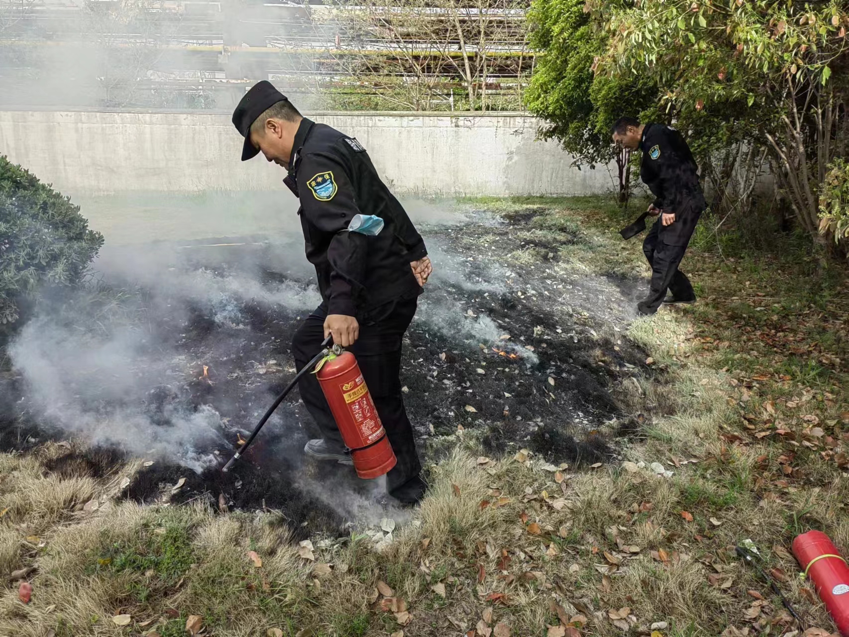 3人急忙奔到門(mén)崗室拿起滅火器趕往現場(chǎng),此時(shí)草坪正在燃燒,且火借風(fēng)勢逐漸擴大。3人迅速拉開(kāi)滅火器,趕緊對準著(zhù)火位置滅火,由于撲滅及時(shí),避免了火情大范圍蔓延,最大限度地降低了植被損失。