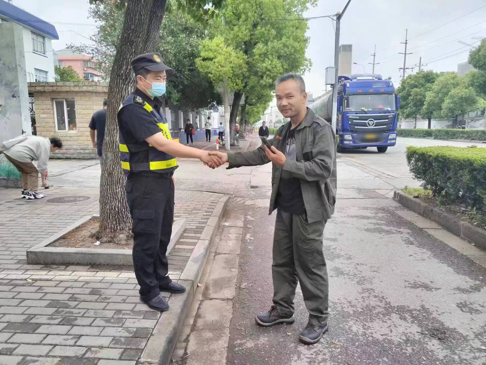 男士拿著(zhù)手機,再三向宗保員工李東鑫道謝,并拿出一包香煙要塞給李東鑫,被李東鑫婉言謝絕了。為表示感謝,該男士特意撥打了12345上海市民熱線(xiàn),贊揚了宗保公司員工拾金不昧的行為。
