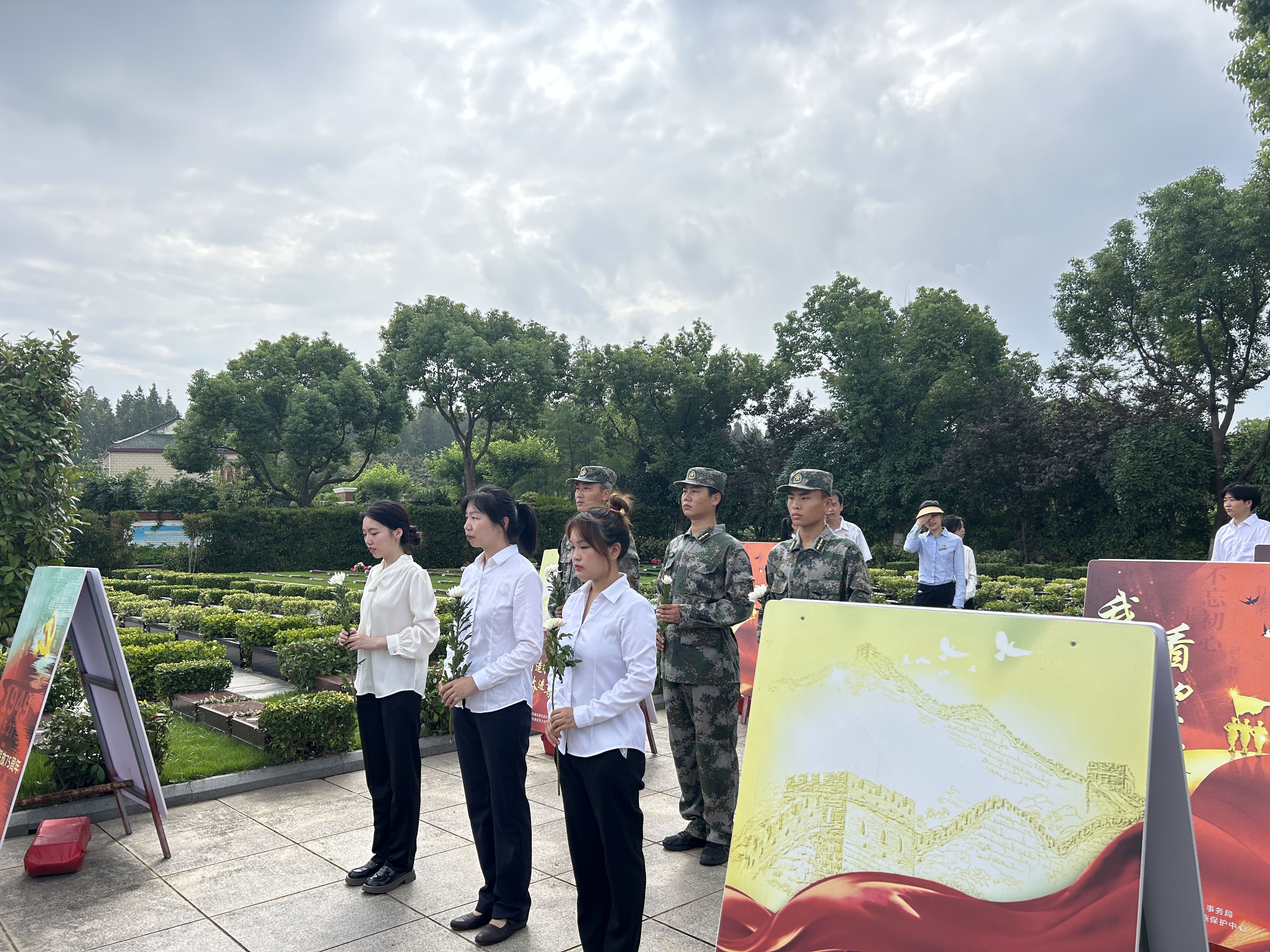 公司退役軍人員工志愿者和新區烈士紀念設施保護中心工作人員每到一處陵園一座紀念碑,他們都首先在陵園紀念碑前,列隊肅立、低頭默哀,敬獻鮮花、寄托哀思。