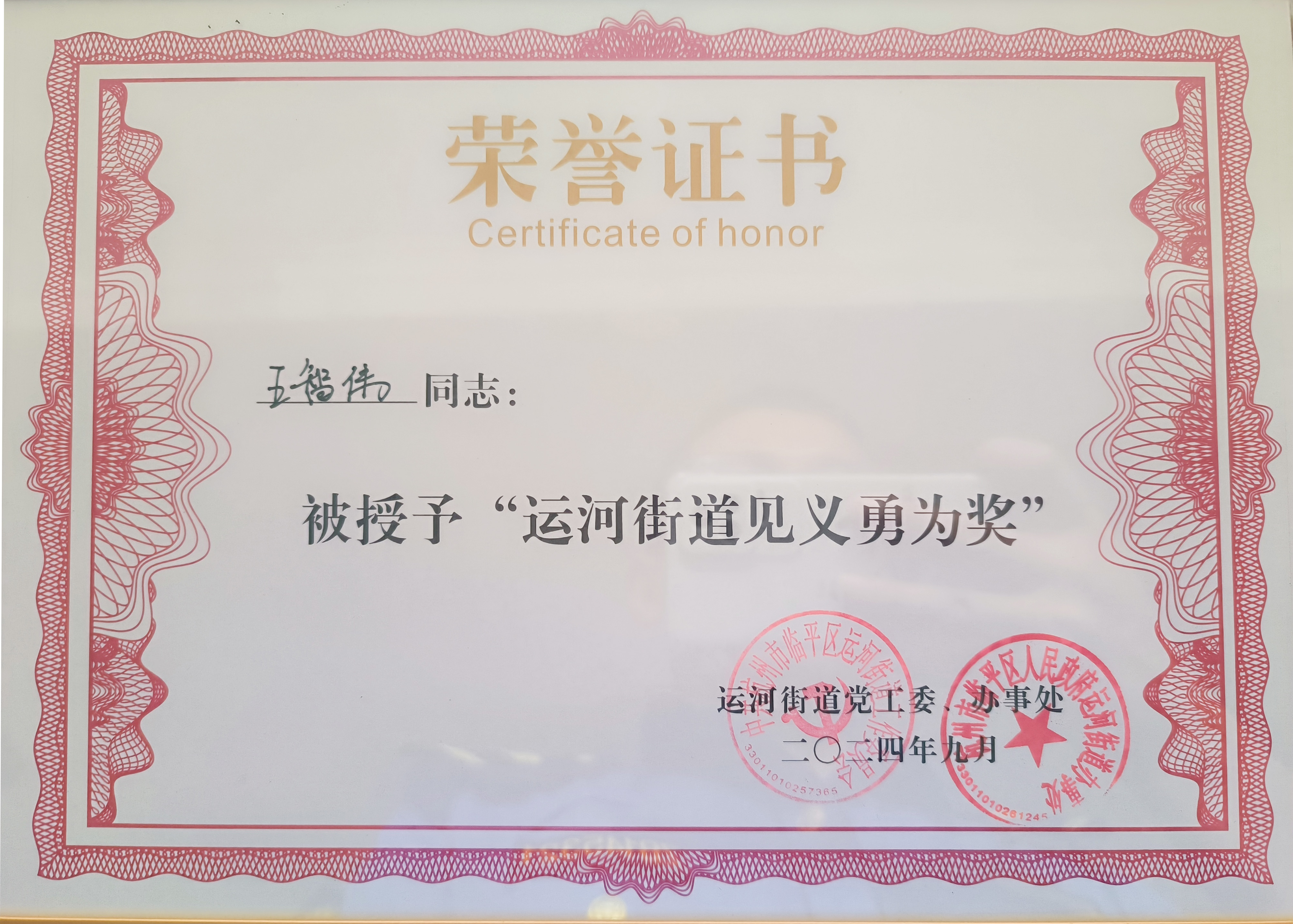 9月14日,浙江民泰公司駐杭州市臨平區運河市容項目3名員工被運河街道黨工委、辦事處授予“運河街道見(jiàn)義勇為獎”。
