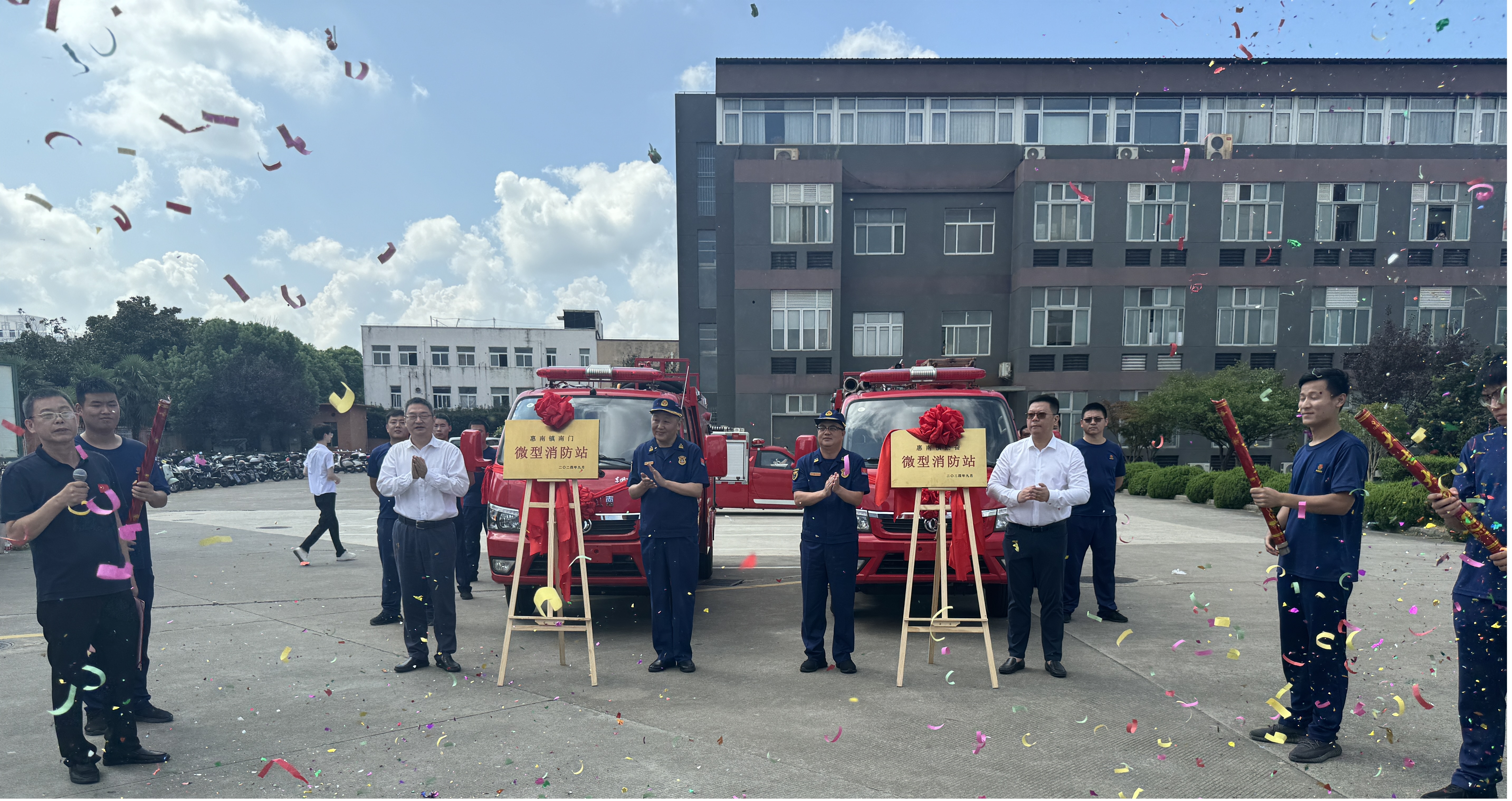 9:00綜合演練開(kāi)始前,浦東新區消防救援支隊支隊長(cháng)姜亦山、副支隊長(cháng)吳新、惠南鎮黨委書(shū)記江臻宇、黨委副書(shū)記、鎮長(cháng)楊揚共同為兩個(gè)微型消防站揭牌,隨后領(lǐng)導們觀(guān)看了微型消防站配置的消防車(chē)輛和滅火救援器材展示。