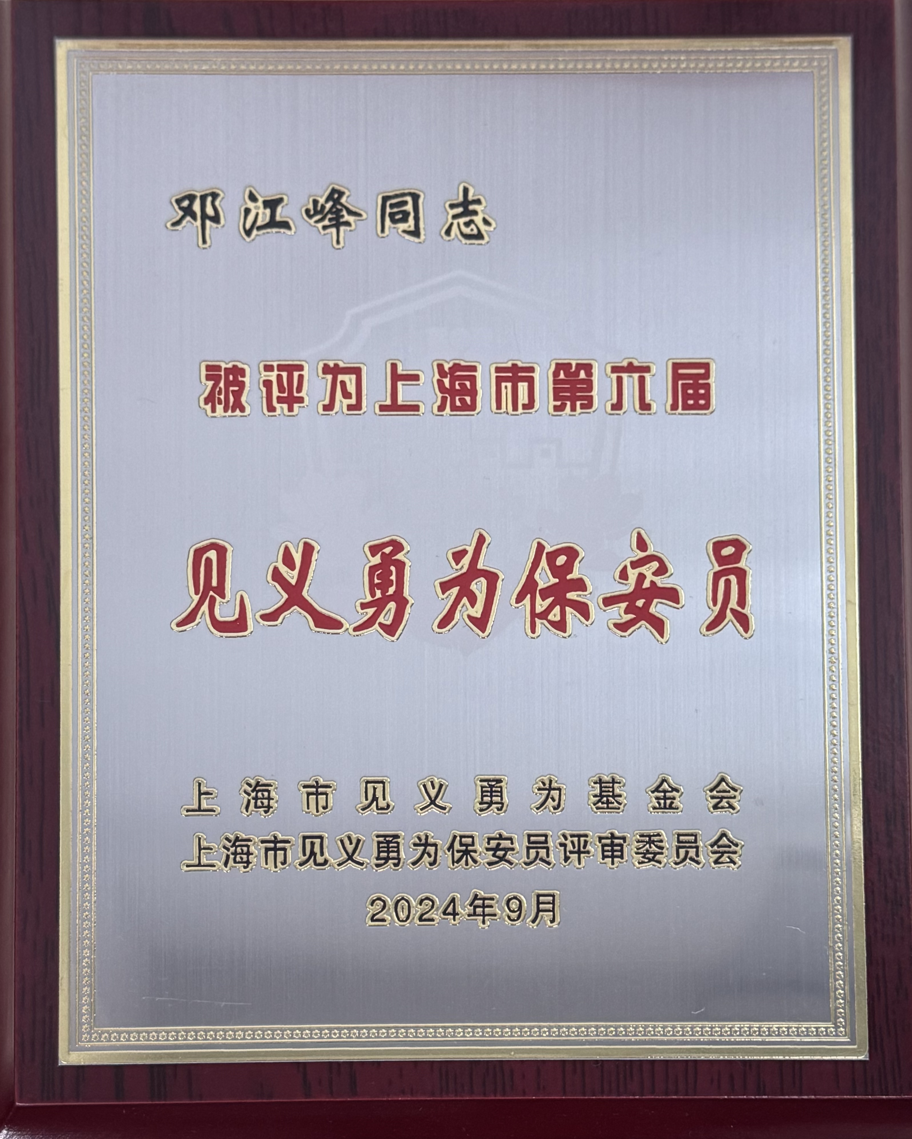 2024年9月27日,上海市見(jiàn)義勇為基金會(huì )在上海市司法局三樓會(huì )議室召開(kāi)2024年二三季度見(jiàn)義勇為先進(jìn)評選表彰發(fā)布會(huì )。會(huì )上,上海宗保保安服務(wù)有限公司員工管旭峰、凌邵凱、吳寶和鄧江峰被評為上海市第六屆“見(jiàn)義勇為保安員”。