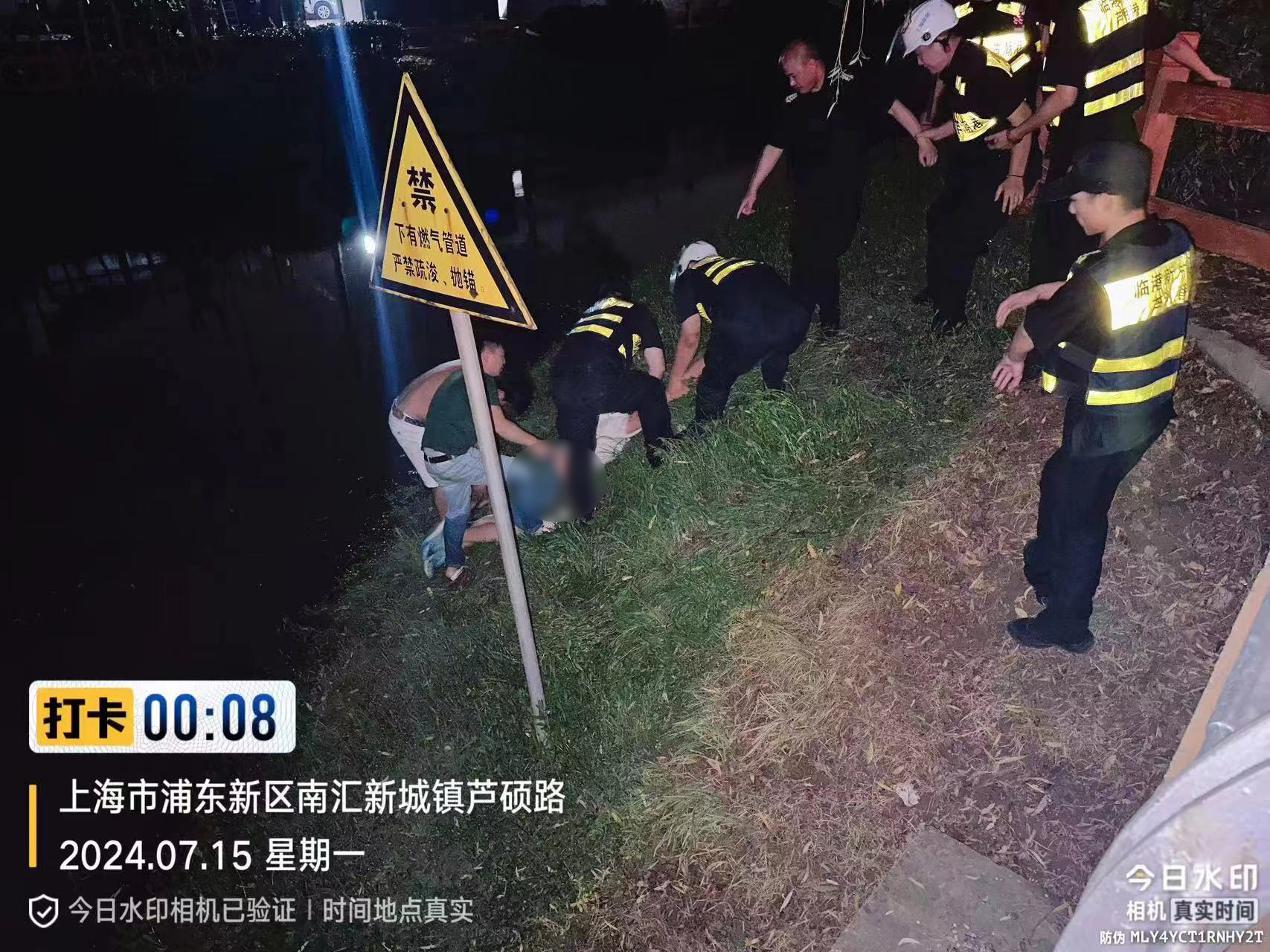 7月14日零時(shí),宗保公司員工管旭峰駕駛巡邏車(chē)經(jīng)過(guò)蘆碩路出潮樂(lè )路東約100米時(shí),發(fā)現多人在河道邊發(fā)生爭執。正欲上前詢(xún)問(wèn)情況時(shí),一名男孩突然跳入河中,情況緊急,管旭鋒立即用對講機呼叫附近巡邏同事前來(lái)支援。