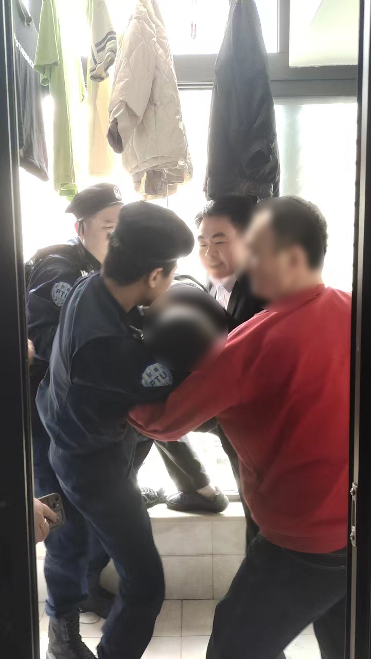 凌邵凱趕緊打開(kāi)房門(mén),輔警李梟琦和一名小區物業(yè)人員迅疾奔到陽(yáng)臺處。凌邵凱、李梟琦、物業(yè)人員以及室內的男子一起拉住女子的手臂和衣服,不顧女子的腳蹬掙扎喊叫,合力將其拉回了屋內。