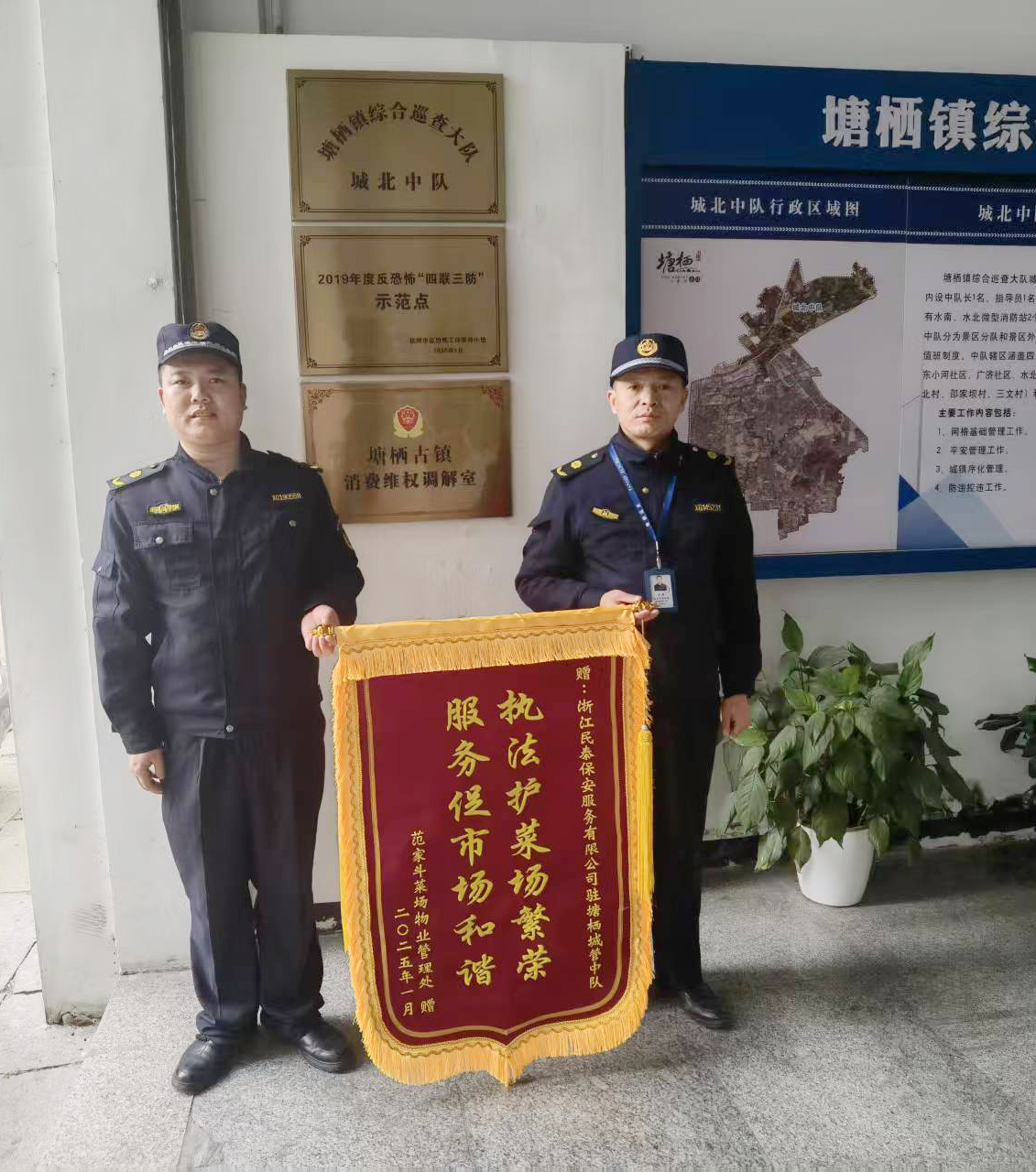 1月13日,浙江民泰公司駐杭州市臨平區塘棲城管中隊輔助項目收到范家斗菜場(chǎng)物業(yè)管理處贈送的繡有“執法護菜場(chǎng)繁榮 服務(wù)保市場(chǎng)和諧”的錦旗,贊揚公司全力協(xié)助物業(yè)管理處維護市場(chǎng)良好秩序的出色表現。
