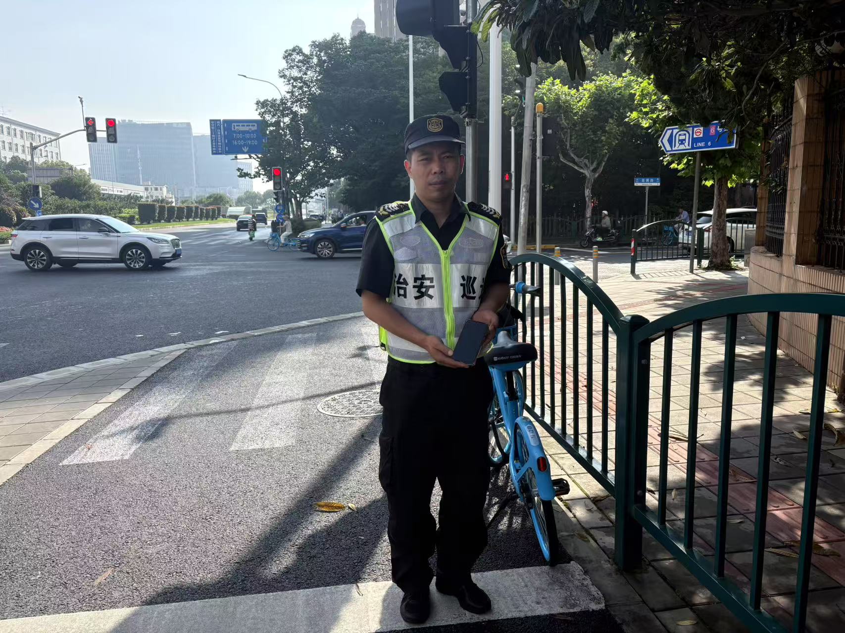 6月5日18:00 ,宗保公司駐閔行區莘莊工業(yè)區項目員工龍彪在鑫都實(shí)驗中學(xué)護校時(shí),撿到一部華為手機,詢(xún)問(wèn)路人無(wú)人認領(lǐng)后,便在學(xué)校門(mén)口邊執勤邊等待失主。