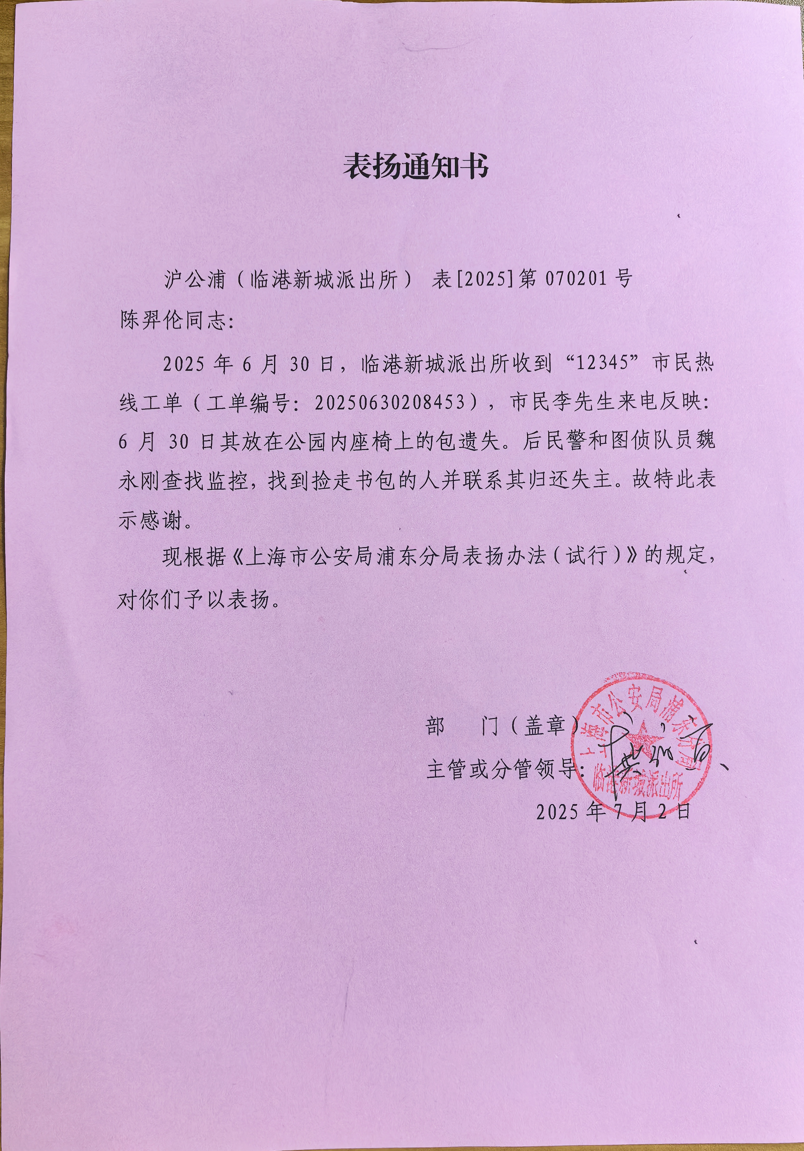 6月15日,宗保公司駐浦東新區臨港新城派出所輔助項目員工王俊遠協(xié)助民警幫助市民張先生找回丟失手機,受到張先生致電上海政務(wù)服務(wù)便民熱線(xiàn)12345點(diǎn)名贊揚。