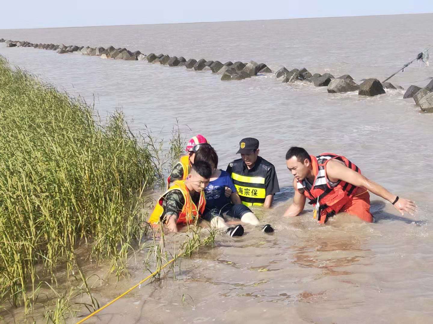 “快看那邊,水里有人?!?0月2日下午14:10,宗保特保隊員在海堤上巡查時(shí),發(fā)現在海水中的礁石上困著(zhù)一對青年男女。當時(shí),海水不斷上漲,很快就要淹沒(méi)礁石,兩名游客緊張得瑟瑟發(fā)抖,情況危急。