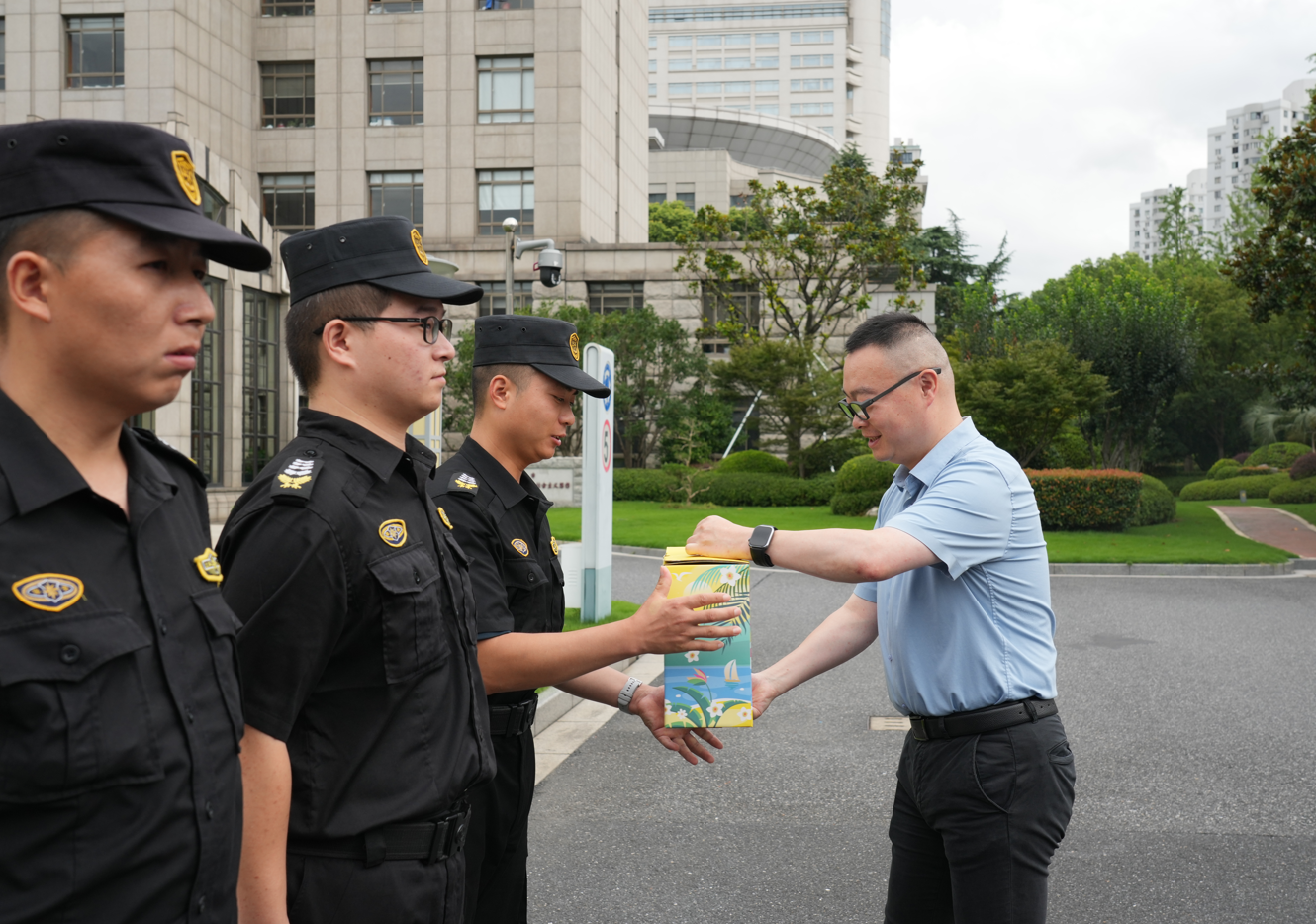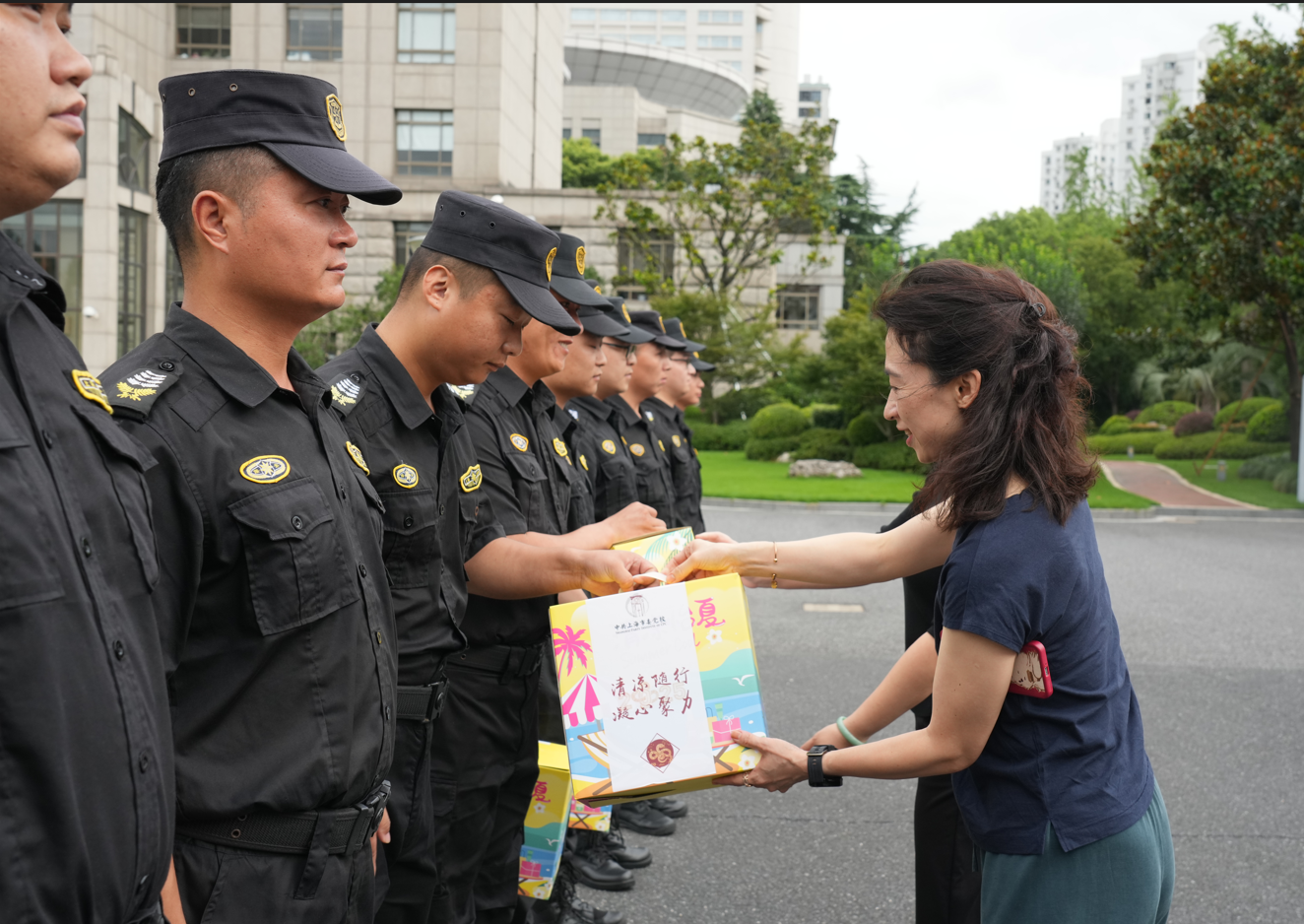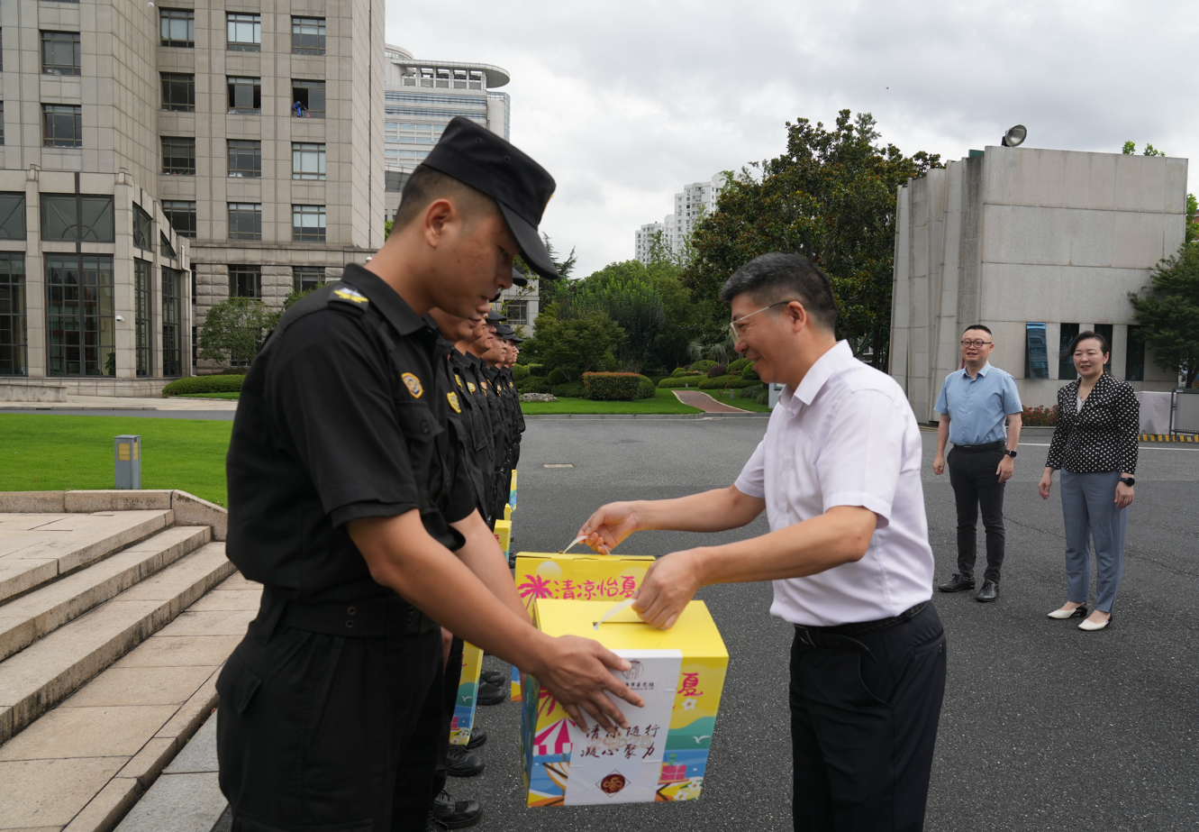 7月29日,上海市委黨校副校長(cháng)戴冰一行,頂著(zhù)炎炎烈日,看望慰問(wèn)高溫下堅守崗位的宗保公司員工,為他們送上防暑降溫用品,表達市委黨校對安保人員的關(guān)心和問(wèn)候,感謝大家為維護黨校秩序所付出的辛勤勞動(dòng),叮囑大家安排好休息,照顧好身體。