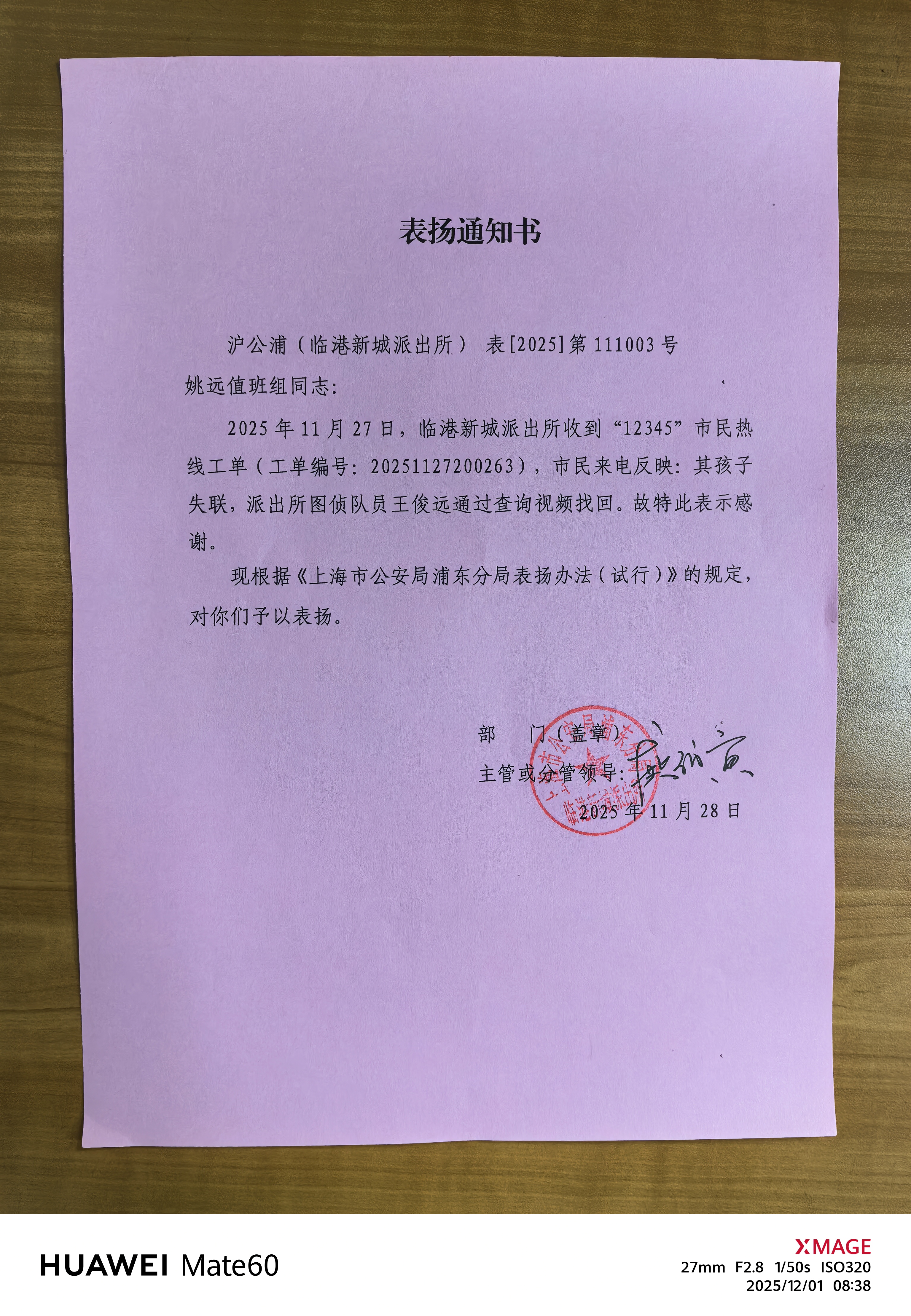 11月26日,宗保公司駐浦東新區臨港新城派出所輔助項目員工王俊遠協(xié)助民警幫助報警人喬女士找到失聯(lián)兒子,受到喬女士致電上海政務(wù)服務(wù)便民熱線(xiàn)12345點(diǎn)名贊揚。