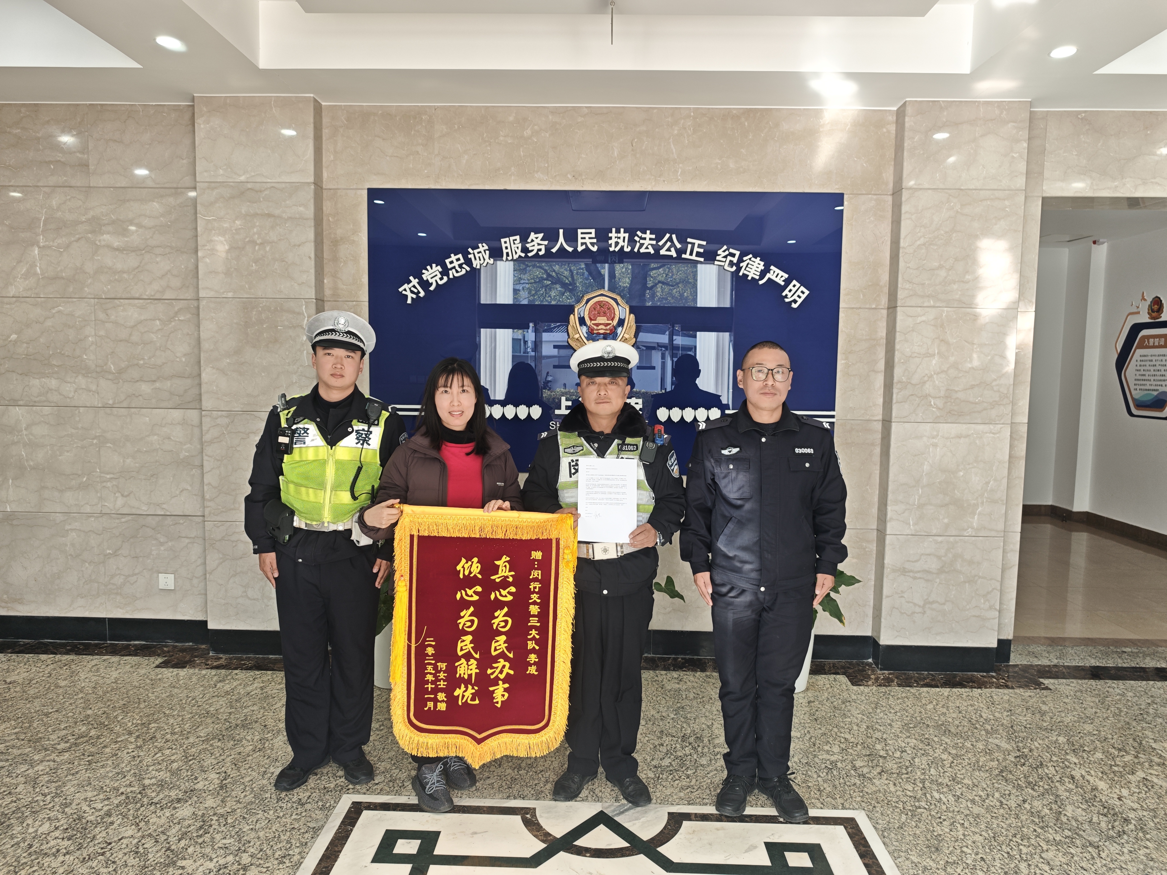 11月29日,宗保公司駐閔行區莘莊梅隴項目員工收到市民何女士贈送的一面繡有“真心為民辦事 傾心為民解憂(yōu)”的錦旗,感謝公司員工李成在緊急時(shí)刻伸出援手,幫其解決車(chē)輛爆胎難題的暖心之舉。