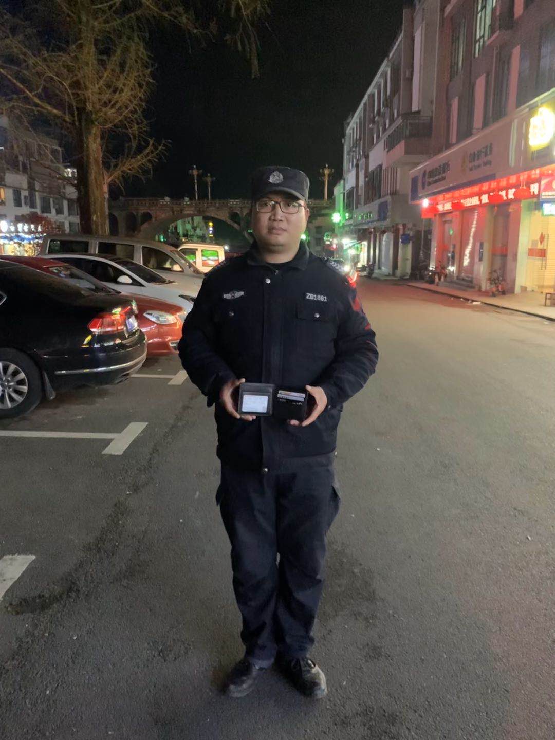 4月1號20:00,宗保公司駐黃山區域湯口市容項目隊員楊興智在湯口鎮沿溪東街巡邏時(shí)撿到一個(gè)錢(qián)包,內有一百元現金一張、銀行卡三張、身份證兩張。