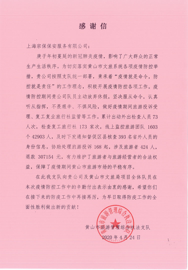 疫情發(fā)生后,宗保人主動(dòng)作為,配合各級政府落實(shí)各項疫情防控措施,積極做好春節期間勸離寺廟(庵)香客,保障居家隔離、集中隔離點(diǎn)隔離,查處活禽出售,核查餐飲店關(guān)閉情況,盤(pán)查車(chē)輛,排查疫區來(lái)滬人員,接送隔離人員,檢查娛樂(lè )場(chǎng)所、人員密集場(chǎng)所等落實(shí)關(guān)閉要求情況,檢測進(jìn)菜場(chǎng)人員體溫,排查賓館、出租房等內的疫區來(lái)滬人員,維護機場(chǎng)航站樓秩序,排查從疫區來(lái)滬的高鐵旅客,宣傳疫情防控知識,維護藥房門(mén)口排隊秩序,保障居民購買(mǎi)防護用品登記,進(jìn)行疫情防控志愿活動(dòng)等17類(lèi)疫情防控輔助工作。
