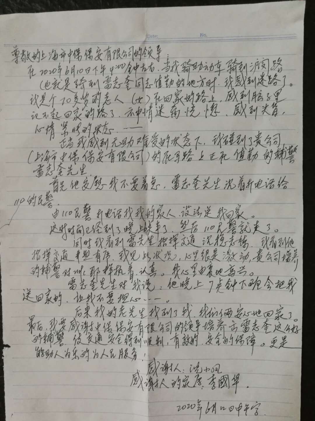 6月12日,宗保公司駐閔行莘莊梅隴交通輔警項目隊員雷志奎收到市民沈小鳳老人家屬寄來(lái)的一封感謝信。