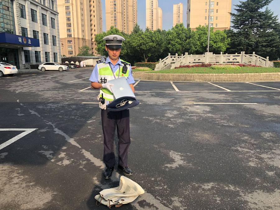 7月22日7:10,浙江民泰駐閑林交通輔警項目隊員張龍、李丹兩人在02省道閑富路北口站高峰崗執勤時(shí),發(fā)現一輛由西向東直行的電動(dòng)車(chē)后座掉落一個(gè)米色背包。張龍趕緊呼叫車(chē)主,可是車(chē)主未能聽(tīng)見(jiàn),繼續向前行駛。