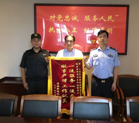 7月31日,臨港新城派出所副所長(cháng)施軍杰將一面繡有“一流服務(wù),一流態(tài)度,做事嚴謹,工作認真”的錦旗送到宗保公司臨港區域項目經(jīng)理王書(shū)劍和隊長(cháng)張龍手中,并合影留念。